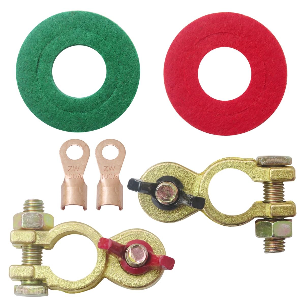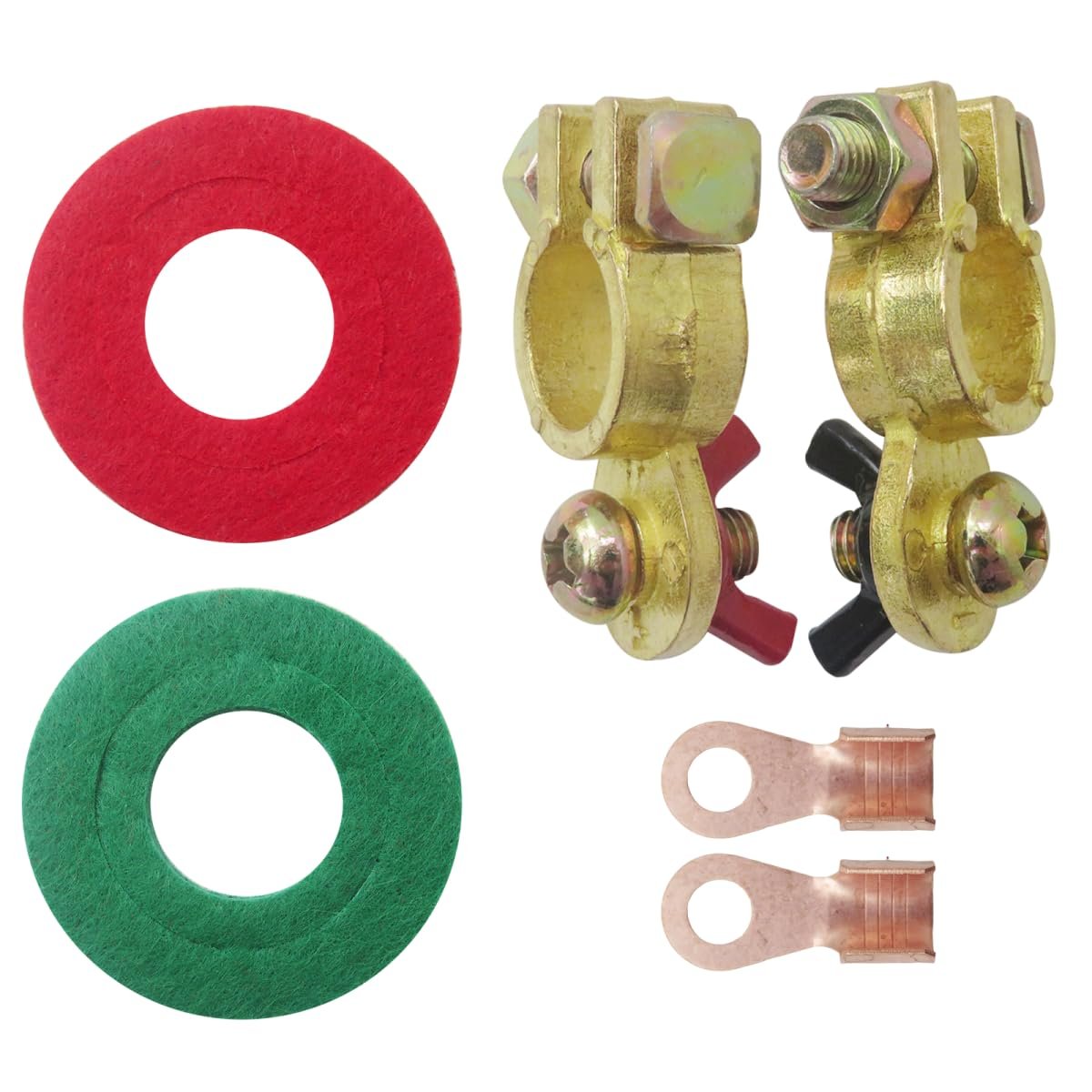 Battery Connector Wing Nuts Battery terminals clamps with color-coded positive & negative wing nuts, which not only can help you identify positive and negative fast, also can help you quick and easy wire replacement without using a wrench.. Prevent C-orrosion With red & green battery terminal protect washer, can use for both top post batteries or cables and side post batteries or cables. Prevent c-orrosion around the battery terminals, prolong battery life.. Size The diameter of the screw: 5/16" (8 mm). Positive Post: 19mm. Negative Post: 17mm.. Safe for Using Easy installation and handling thanks to coated wing nuts, rubberized to minimize electric shocks. (Voltage: 12V or 24V, screw thread: M8.). Widely Used Suitable for heavy-duty trucks, vans, cars, marine boats, engineering machinery, and many more..Other fine products