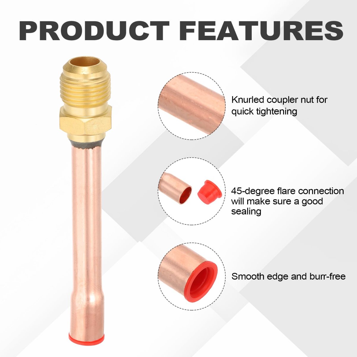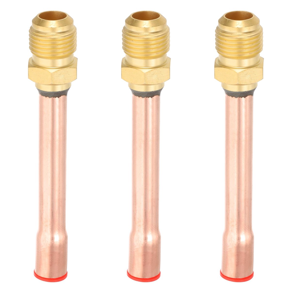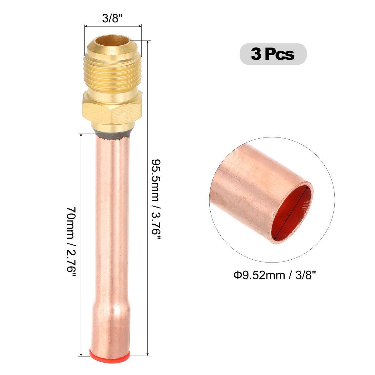 Specifications: Color: Brass Tone, Copper Tone; Material: Brass, Copper; Male Thread Size: 3/8" SAE; Tube Part Length: 70mm / 2.76inch; Copper tube ID: 9.52mm / 3/8 inch; Overall Length: 95.5mm / 3.76 inch; Packing List: 3 x Air Conditioner flare connector.. Advantages: 1. Made from brass material for excellent corrosion resistance and strength.; 2. 45-degree flare connection will make sure good sealing.. Instruction: Easy to use, connect the threaded end with a flared copper pipe and tighten with the flare nut (not included), and weld the other end to a copper pipe.. Application: The brass pipe fitting is suitable for copper pipe connection and extention, widely used for air conditioner indoor unit , HVAC Systems, hydraulic applications, A/C mini split unit, refrigeration systems etc..Other fine products