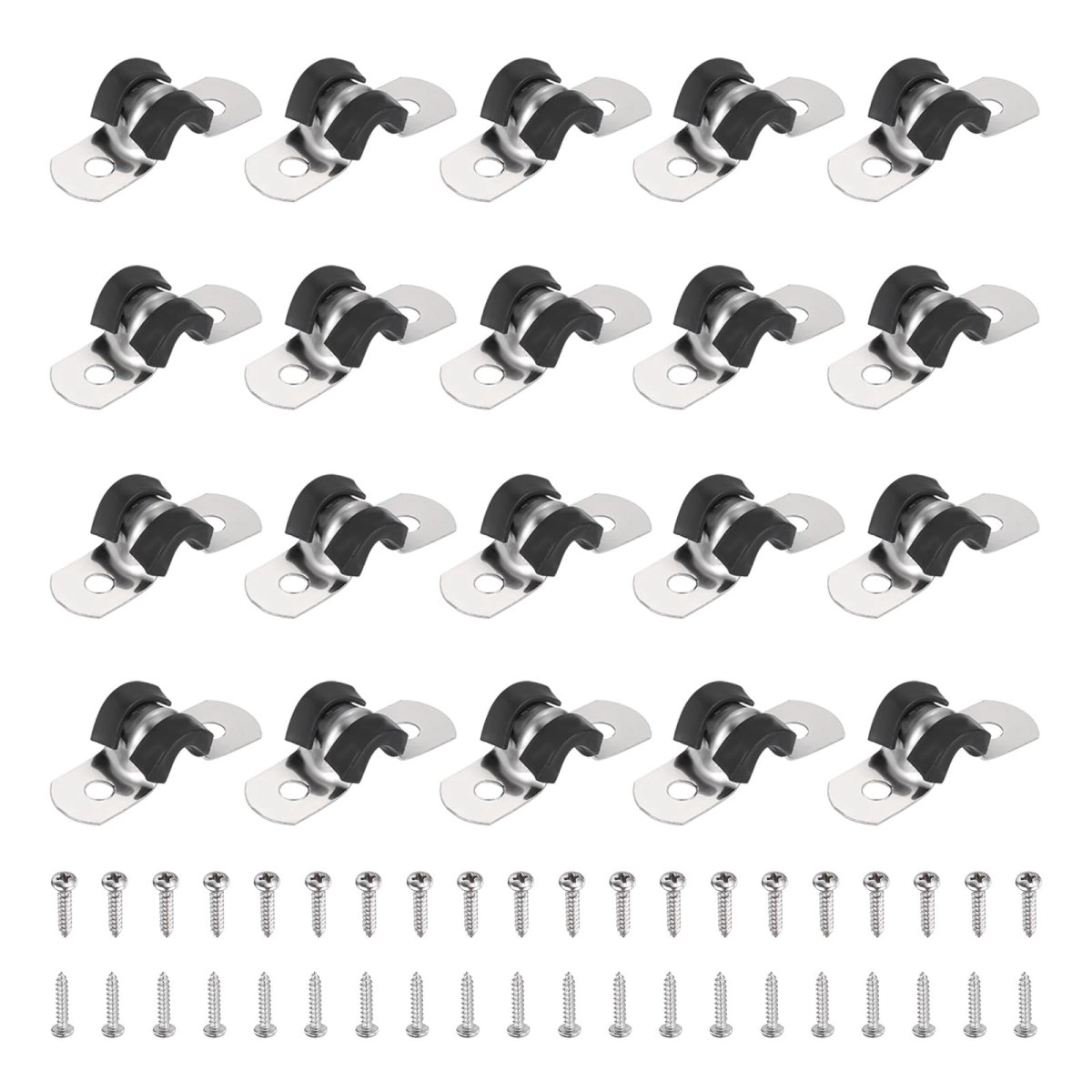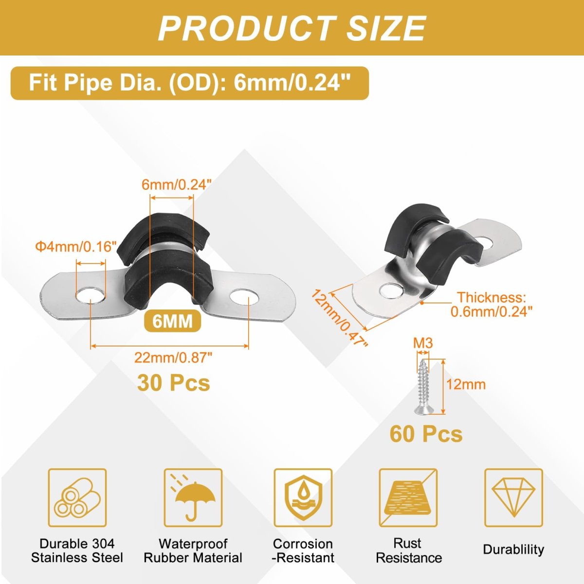 Material: 304 Stainless Steel, EPDM Rubber; Stainless Steel Clamp Width: 12mm/0.47"; Fit Pipe Dia. (OD): 6mm/0.24"; Thickness: 0.6mm/0.24"; Hole Dia.: 4mm/0.16"; Hole Spacing: 22mm/0.87"; Screws Size(DiaxL): M3x12mm; Package Contents: 30 Pcs x Cable Clamps, 60 Pcs x Screws. Durable Material: The cable clamp is crafted from 304 stainless steel and EPDM rubber cushioned pads for durability, it is oil-proof, waterproof, anti-oxidation, rust and corrosion-resistant, and the elastic rubber material provides effective buffering and insulation properties.. U-Tube Design: The U-Tube opening design facilitates easy attachment of pipe clamps to surfaces. The U-style curvature and rubber pad offer stable support for securing the pipe, safeguarding cables and pipes, minimizing wear, and extending the service life of the pipes.. Application: These cable clamps have a wide range of applications and are used in automotive, industrial, marine, home, construction, and other area. Commonly used for line management and maintenance. Suitable for stainless steel pipes, rubber hoses, plastic steel pipes, gas pipes, indoor and outdoor fixing of wires and cables..Other fine products