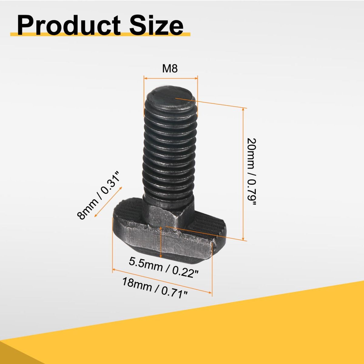 [Package&Size]: Material: Carbon Steel; Color: Black; Applicable Aluminum Profile: 40 Series; Screw Thread Diameter: M8; Screw Rod Size: 8 x 20mm /0.31" x 0.79"(D*L); Pitch: 1.25mm / 0.05" Screw Head Size: 18 x 8 x 5.5mm/ 0.71" x 0.31" x 0.22"( L*W*T); Package Content: 30 Piece x T Slot Drop-in Bolts. [Material] Made of carbon steel, the T slot drop-in bolts have certain strength and hardness, corrosion resistance, wear resistance, are strong and durable, and have a long service life. [Feature] These hammer head bolts have a smooth surface and clear threads, Able to withstand high-intensity torque, not easy to slip off or over-tighten, these T-shaped bolts are fixed between aluminum profiles and accessories, and are used with T-nuts, knobs or T-tracks to create a variety of projects. [Easy to Install] T shape stud sliding screws are easy to install. First, confirm the size of your aluminum profile or T-slot. When installing, place the screw head into the profile slot and rotate 90 degrees to clamp. [Wide Application] T-slot embedded bolts are widely used in aluminum alloy, rack assembly, clamping locks, T-slot guide rails, etc. They can also be used in furniture assembly, papermaking machines, etc. They are most commonly used in the assembly of lifting, metallurgy, mechanical equipment, and power mechanical equipment, as well as the fixing of mechanical equipment.Other fine products
