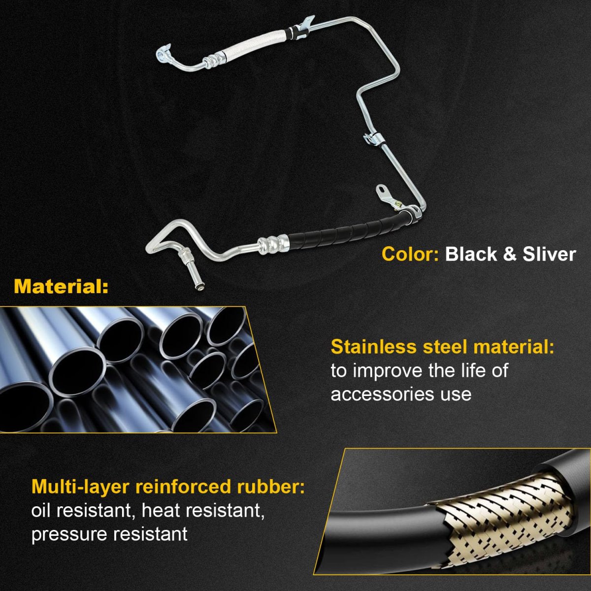 COMPATIBLE MODELS: Power Steering Pressure Hose compatible with Toyota For Highlander 2001 2002 2003. REPLACE NUMBERS: 3401189444104-81004441048100. SPECIFICATIONS: Power Steering Pressure Hose (high pressure hose) is made of sturdy rubber and alloy, which shows good strength, toughness and is not easy to wear and break. Pressure Hoses with a Max working pressure of 1, 500 psi a burst pressure rating of 8, 700 psi and a tensile strength of 1, 600 lb. This provides exceptional durability and long life. WHY REPLACE: When the steering system shows signs of leakage or inconsistent power assist which means the power steering line for points of failure. Often times leaks will be found in the junctions between components or at the crimped connections between flexible and ridged sections,Replace the old and worn power steering pressure hose. Get rid of the power steering noise and oil leakage, insure the good performance of your vehicle.Other fine products