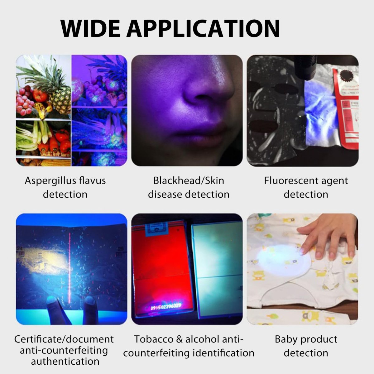 [Long Battery Life] : Built-in lithium battery offers 240-360 minutes of continuous use, with convenient usb charging compatibility.. [Multi-purpose Use] : Highlights fluorescent materials to identify pet , detects cat ringworm, and verifies banknotes, amber, and jewelry authenticity.. [Compact & Portable] : Small in size, this flashlight easily fits in pockets, toolboxes, or backpacks for on-the-go use anytime, anywhere.. [Aluminum Alloy] : Crafted from aluminum alloy for longevity and effective heat dissipation.. [Precise Light] : Emits a 365nm light unseen by the naked eye, for detecting fluorescent agents and security codes..