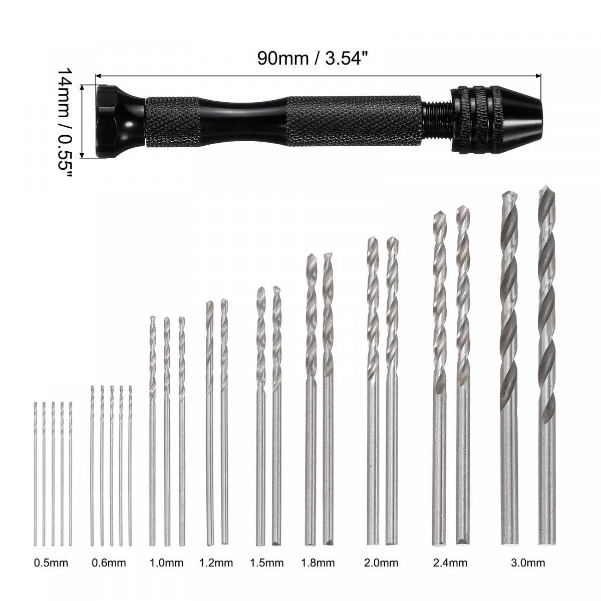 PCB Drill Bits: 10 different sizes: 0.3mm, 0.4mm, 0.5mm, 0.6mm, 0.7mm, 0.8mm, 0.9mm, 1.0mm, 1.1mm, 1.2mm; Shank Dia.: 3.175mm / 1/8". High hardness, high wear resistance, high strength, resistance to bending. Used for precision drilling in PC boards, plastic, fiberglass, wood, soft metal.. Precise Pin Vise: Made of aluminum alloy, the pin vise hand drill is durable and firm. Vise head can be easily adjustable to clamp different drill bits sizes. Pen style design, compact size, and light weight.. Wide Applications: 3-claw hardened steel chuck can firmly hold micro drill bits. Widely used for drilling precise holes on wood, plastic, walnut, amber, beads, beeswax, olive nut, small model kit and other DIY projects. Tips: the pin vise is a manual tool instead of a power tool.. Package Included: 1pcs x Pin Vise Hand Drill, 10pcs x 0.3mm-1.2mm PCB Drill Bits (1pcs of each size), 25pcs x Twist Drill Bits (5pcs of 0.5mm 0.6mm size, 3pcs of 1.0mm size, 2pcs of 1.2mm 1.5mm 1.8mm 2.0mm 2.35mm 3.0mm size).