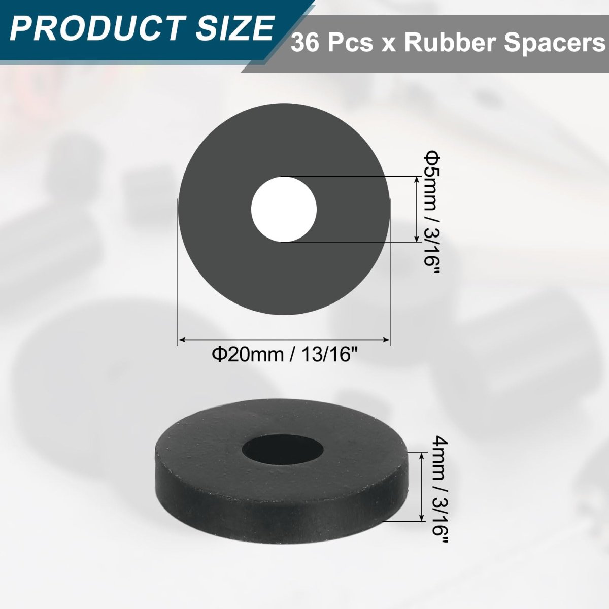 [Package and Size]: Overall Size: 20 x 5 x 4-mm / (13/16 x 3/16 x 3/16-inch) (OD*ID*Thickness); Package Content: 36 Pcs x Rubber Spacers. [Material]: The flat spacer washers are made of rubber material, which is tough and wear-resistant, waterproof and reliable, non-slip and elastic, not easy to crack, shrink, break or deform, and provide you with a long service life.. [Practical Function]: The multi-purpose rubber spacers can not only help increase the height of equipment but also have an anti-slip function and effectively reduce vibration and absorb shock, making them an indispensable auxiliary tool in daily furniture and machinery maintenance.. [Easy to Use]: Rubber spacer bushings are easy and convenient to use, without additional tools, just choose the right size pad and snap the item to be installed into the hole. You can use them flexibly in various scenes as needed.. [Wide Application]: These rubber washers are widely used in furniture, industry, household appliances, car accessories, sport equipment, and various machinery and equipment etc., which can bring more convenience to your work or life..