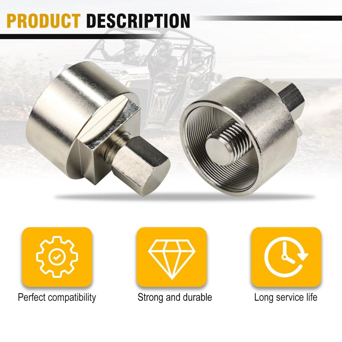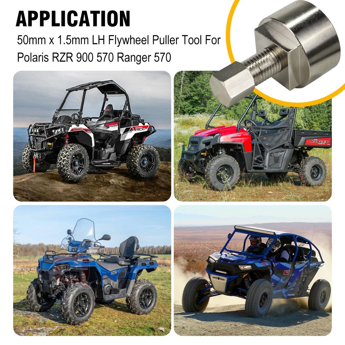APPLICATION - This flywheel puller tool designed for Polaris RZR 1000 900 570 2011- UPRanger 900 2011- UP; Ranger 1000 2017- UP; General 1000 2016- UP; Ranger 570 2014- UP; Sportsman 850 2009- UP; Sportsman 570 2014- UP; ACE 570 2016- UP.. : Our flywheel puller is made of hardened steel, center thread design, the bolt thread is very coarse, avoiding the puller stripping problem, strong and durable.. SIZE-Flywheel puller is 50mm diameter x 1.5 left-hand thread pitch-female.. Benefits - For removal of Polaris rotor/flywheel part numbers 4013225, 4014404, 4013969 and others. It is recommended to apply lubrication to the tool before use to ensure smooth and efficient operation..Other fine products