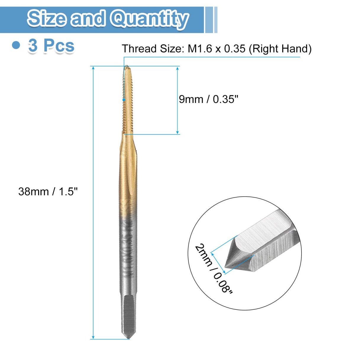 Thread Tap Size: Metric thread size: M1.6 x 0.35 (right hand); thread length: 9mm / 0.35"; total length: 38mm / 1.5"; square shank width: 2mm / 0.08"; accuracy: H2. Straight Flute Tap: The tapping tool adopts straight flute design, clear threads, and right hand cutting direction. Threading tap provides rapid downward chip removal to achieve efficient thread cutting, suitable for processing through holes or shallow holes.. Wide Applications: Screw thread tap can create new threads or re-thread damaged or jammed threads. Widely used for most metals, iron plate, copper, zinc, alloy steel, abrasive steel, A3 steel, stainless steel, etc.. Add proper tapping oil for higher quality internal threads and more durable taps.. Material & Finish: 6542 (M2) high speed steel tap offers high hardness and excellent wear resistance for durability and longevity, and good cutting performance for clean, precise holes. Titanium coating offers enhanced hardness, corrosion and rust resistance, heat resistance, and reduced friction for smoother tapping.. Tips: Machine tap is used with drill presses, tapping/CNC/milling machines. NOT recommended for hand and electric drill tapping. The higher the hardness, the slower the speed. Drill the holes with a twist drill bit first, then tap with a thread tap. The tapping angle should be 90 degrees vertical and stable..