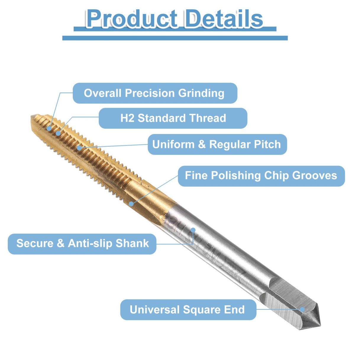Thread Tap Size: Metric thread size: M5 x 0.8 (right hand); thread length: 21mm / 0.83"; total length: 61mm / 2.4"; square shank width: 5mm / 0.2"; accuracy: H2. Straight Flute Tap: The tapping tool adopts straight flute design, clear threads, and right hand cutting direction. Threading tap provides rapid downward chip removal to achieve efficient thread cutting, suitable for processing through holes or shallow holes.. Wide Applications: Screw thread tap can create new threads or re-thread damaged or jammed threads. Widely used for most metals, iron plate, copper, zinc, alloy steel, abrasive steel, A3 steel, stainless steel, etc.. Add proper tapping oil for higher quality internal threads and more durable taps.. Material & Finish: 6542 (M2) high speed steel tap offers high hardness and excellent wear resistance for durability and longevity, and good cutting performance for clean, precise holes. Titanium coating offers enhanced hardness, corrosion and rust resistance, heat resistance, and reduced friction for smoother tapping.. Tips: Machine tap is used with drill presses, tapping/CNC/milling machines. NOT recommended for hand and electric drill tapping. The higher the hardness, the slower the speed. Drill the holes with a twist drill bit first, then tap with a thread tap. The tapping angle should be 90 degrees vertical and stable..Other fine products