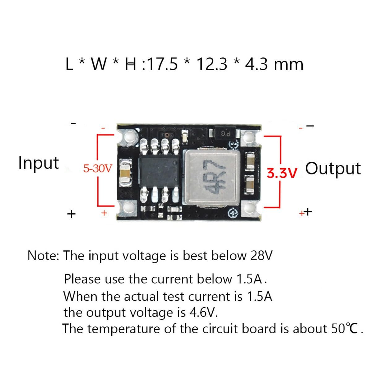 Very small size, length, width and height are 17.5*12.3*4.3mm,Input: 4.5V-24V,Output: 3.3V. The maximum output current can reach 1.5A, when the output current is 1.3A, the output voltage is 3.2V. Output ripple: less than 30 mV; Switching frequency: 1.5 MHz (highest), typically 1 MHz. Package: 5PCS 3.3V Buck Module.Other fine products