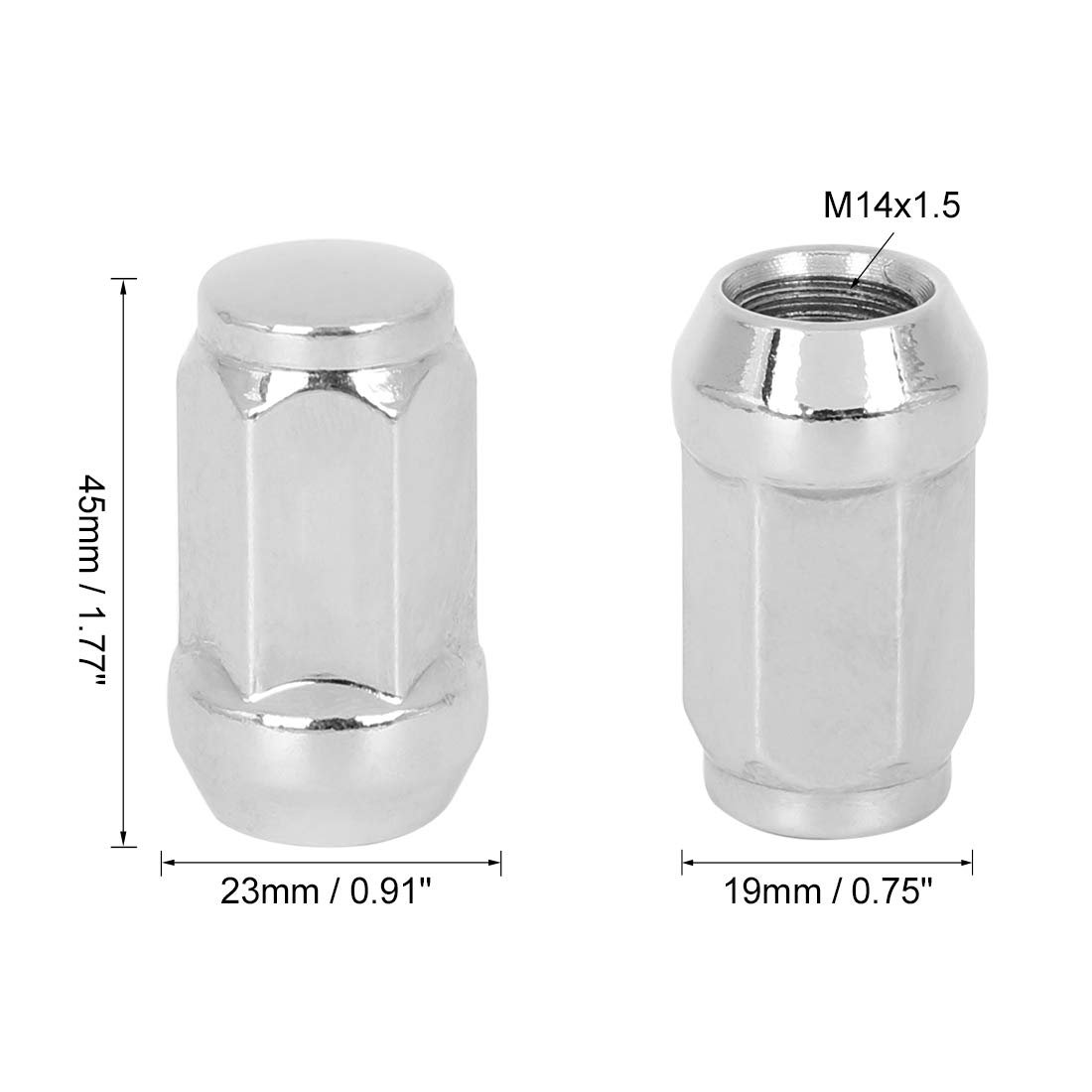[M14x1.5 Wheel Lug Nuts] Thread pitch 14mmx1.5, Overall length 1.77" (45mm), Width 0.91"(23mm) , Closed end, 60 Degree conical seat. Total size is 45x23mm / 1.77"x0.91" (L*W).. [] Manufactured with through-hardened steel for dependable strength and durability, paint will not fall off easily.. [Perfect Performance] Plating with essential layers of copper nickel and chrome to provide exceptional strength beauty and corrosion resistance.. [Package Include] 4 x Lug Nuts.Other fine products