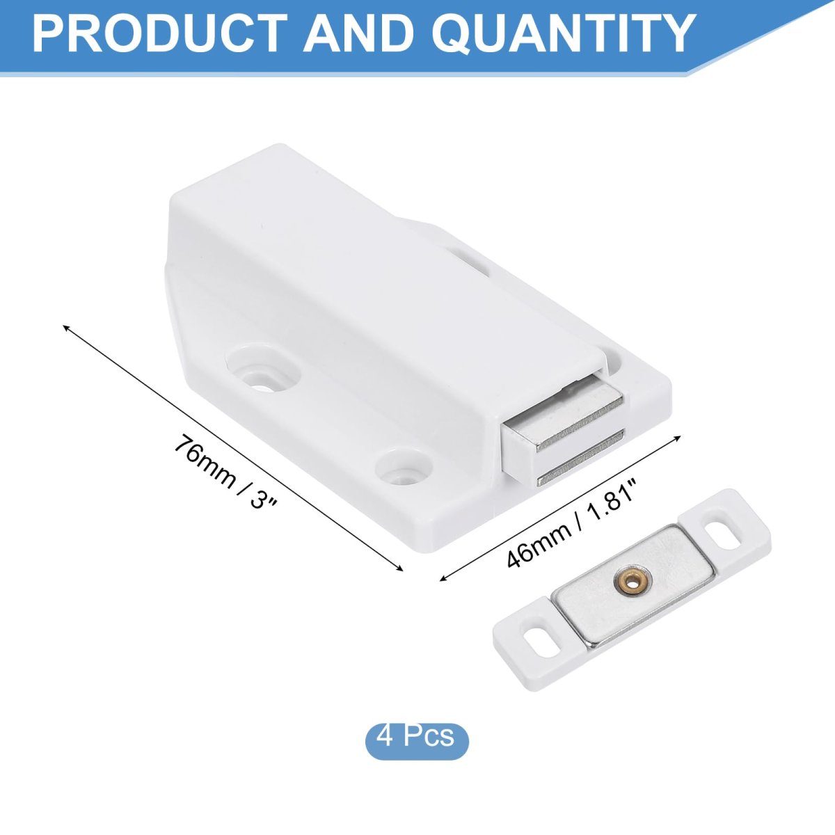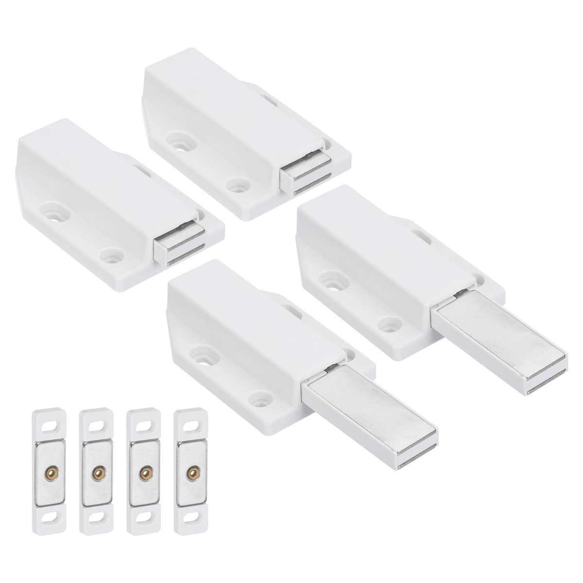What you get: You will get 4 Pcs of Magnetic Push Latch, which made of Plastic and color is White. The Latch length is 76 mm / 3 inch, width is 46 mm / 1.81 inch, height is 12 mm / 0.47 inch.. Material: Made of Good-Quality base and durable spring mechanism ensures anti-rust and corrosion resistance, making it a timeless choice for medium-sized doors.. Design: Our push to open system is designed with snaps at the tail and head of the base, which makes the latches more stable and not easy to fall off.. Easy to Use: Built-in spring-loaded plunger, you can just simply press the door to latch. Eliminates the need for handles or knobs. Create the clean, seamless look of no knobs. Suitable for use with hinges without self-closing feature.. Secure Closure: Our push to open system features a long-stroke design with a built-in magnet that ensures a secure close point, preventing "drifting open" doors. You can rotate the magnetic tip of the inner core left or right to adjust its extra extension length of 2-9 mm to fit the gap of the door..Other fine products