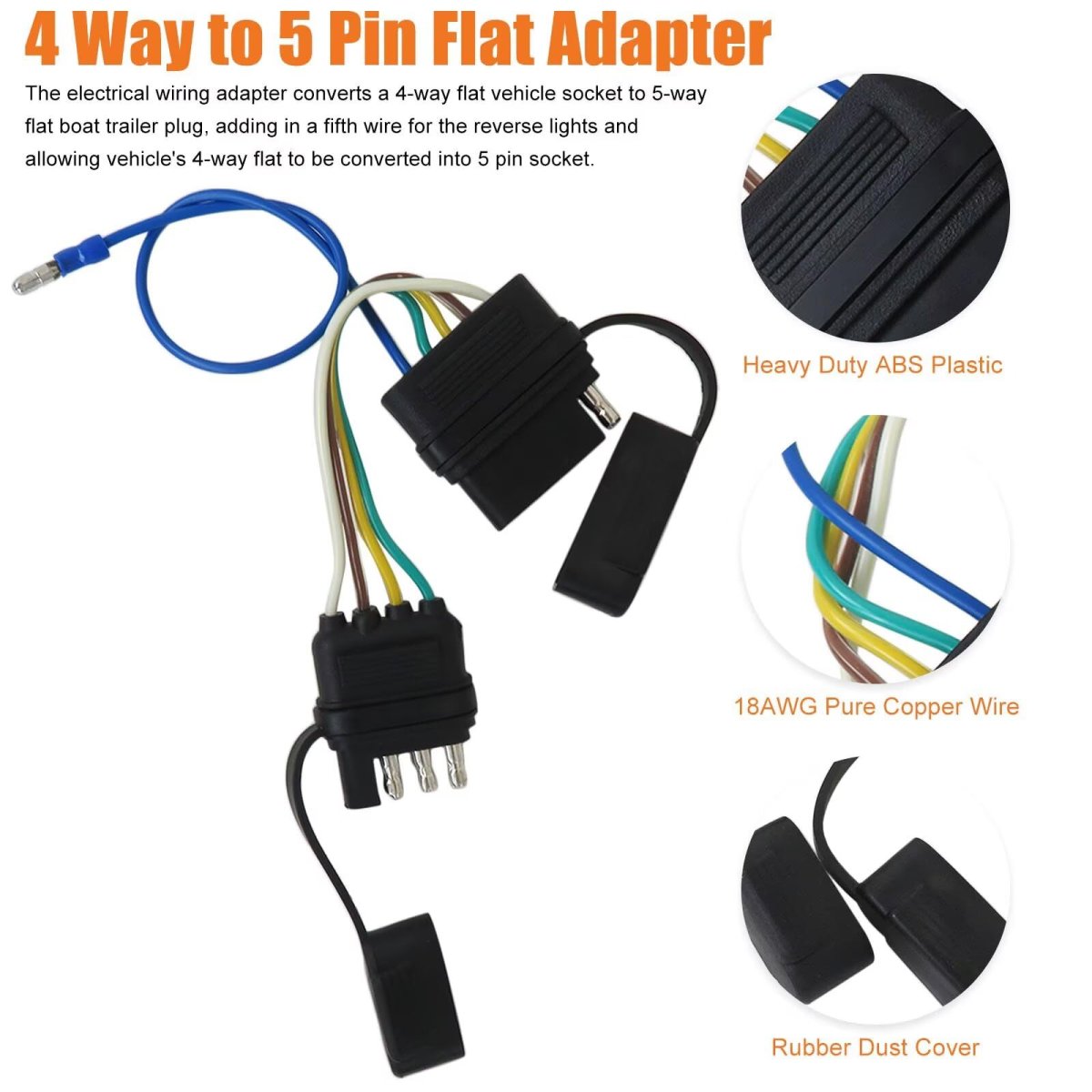 Compatibility: Specifically designed for boat trailers with surge brakes, and fits all vehicle models with 4-way flat connector, and your Boat trailer comes with a 5-way flat plug. Usage: The electrical wiring adapter converts a 4-way flat vehicle socket to 5-way flat boat trailer plug, adding in a fifth wire for the reverse lights and allowing vehicle's 4-way flat to be converted into 5 pin socket. It can be used to connect the taillights, brake lights, turn signals and reverse lights. Excellent Workmanship: Both of the heavy-duty 18-gauge wires equips with rubber dust cover, protects the terminals from water and dust when not in use. Wire harness kit are molded and features thickened PVC wire coating materials for anti-corrosion, good-quality copper wires for good conductivity. Package Includes: 4-Way to 5-Way Flat Trailer Wiring Adapter Kit as pictured.Other fine products