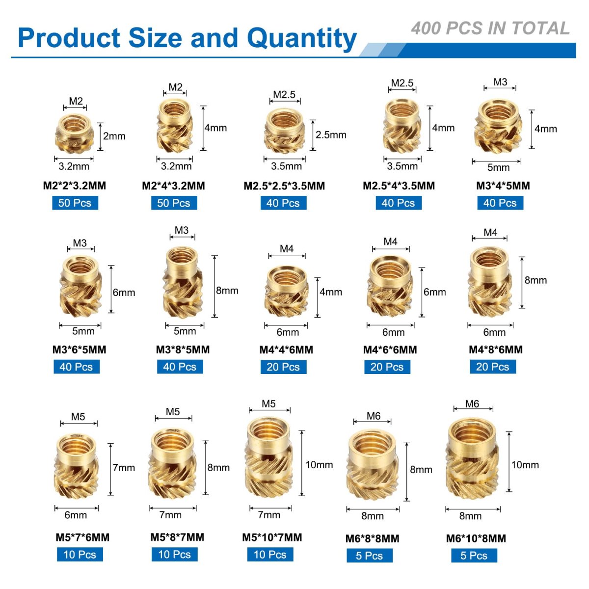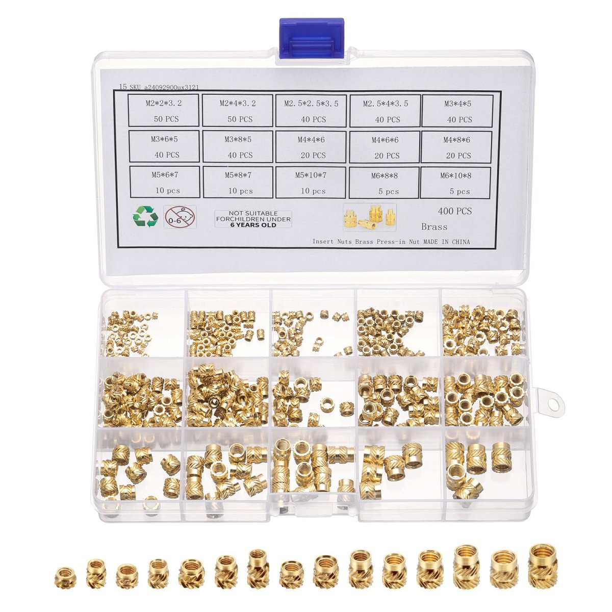 - 400pcs M2 5 M3 M4 M5 M6 Metric Threaded Inserts Brass Heat Set Knurled Nuts Assortment Kit 3d Printing Female Insert