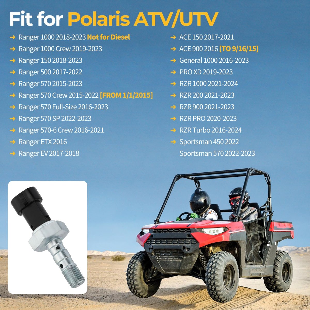 Manufacturer Part# 4014262. Fitment: Fit for Polaris Ranger 1000 2018-2023 Not for Diesel Ranger 1000 Crew 2019-2023 Ranger 150 2018-2023 Ranger 500 2017-2022 Ranger 570 2015-2023 Ranger 570 Crew 2015-2022 [FROM 1/1/2015] Ranger 570 Full-Size 2016-2023 Ranger 570 SP 2022-2023 Ranger 570-6 Crew 2016-2021 Ranger ETX 2016 Ranger EV 2017-2018 RZR 1000 2021-2024 RZR 200 2021-2023 RZR 900 2021-2023 RZR PRO 2020-2023 RZR Turbo 2016-2024 Sportsman 450 2022 Sportsman 570 2022-2023 ACE 150 2017-2. Feature: Made of premium material, this brake pressure switch is not easy to corrode and deform to provide more long-lasting performance.. Package: Brake Pressure Switch x 1. Exact connector ,plug and play, Easy installation..Other fine products