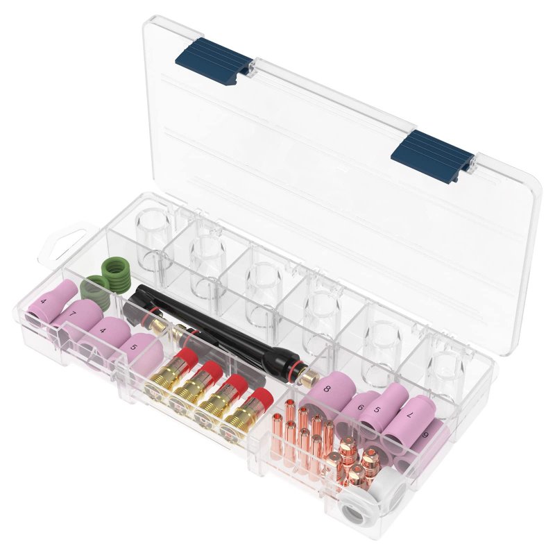 [SPECIFICATION] 49pieces TIG Torch Accessories (consumables).. [APPLICATION] Region free and easy to use, can be used for WP-17 WP-18 WP-26 TIG Welding Torch.. [EXCELLENCE] With excellent plasticity, toughness and crack resistance, especially low temperature impact toughness higher. Uses: for a variety of locations of the pipeline TIG welding arc welding and arc welding, can be satisfied with the welding joints. Can be welded carbon steel and some low alloy steel.. [NOTE] The insulating rings may not match the CK Torch..Other fine products