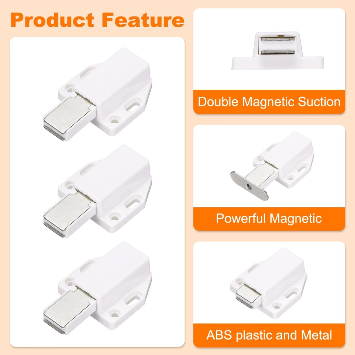 Package Content - 4 magnetic latches accompanied by counter plates, along with 48 pieces of screws; total size is 58 x 36mm/2.3 x 1.4inch (L*W*H). These latches are suitable for ensuring that your cabinets and home doors remain firmly shut.. Material - These magnetic latches are constructed from ABS plastic and zinc alloy, designed to provide durability and ensure a long-lasting performance.. Easy to use - Equipped with an integrated spring-loaded plunger and a magnet, these latches offer a simple press-to-lock and press-to-unlock mechanism. A single press releases the door, allowing it to open, and another press secures it, effectively closing it. Application - Suitable for hinges that lack a self-closing mechanism, this magnetic latch is frequently used in bedrooms, bathrooms, kitchens, and closets. It provides a sleek, seamless appearance without visible seams..Other fine products