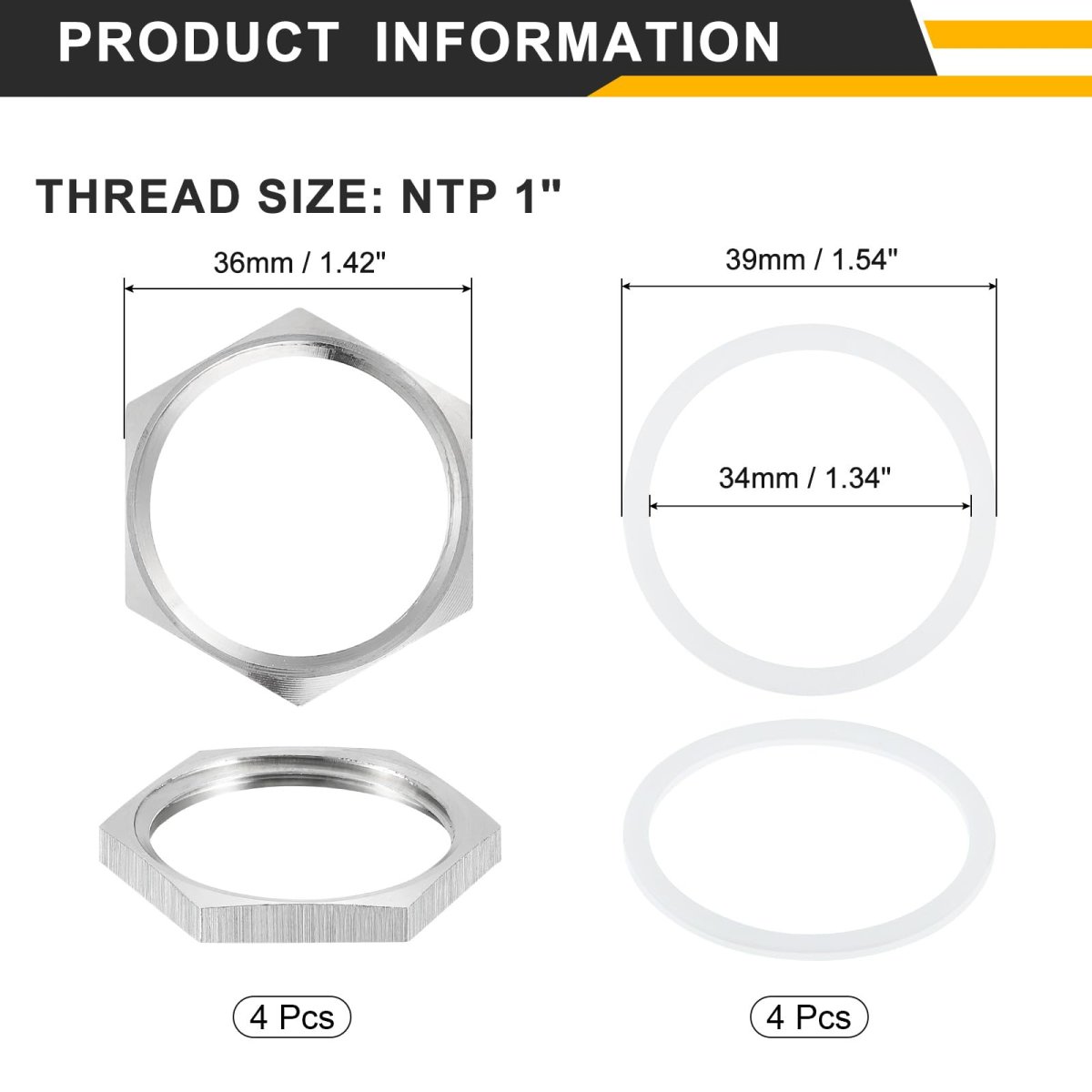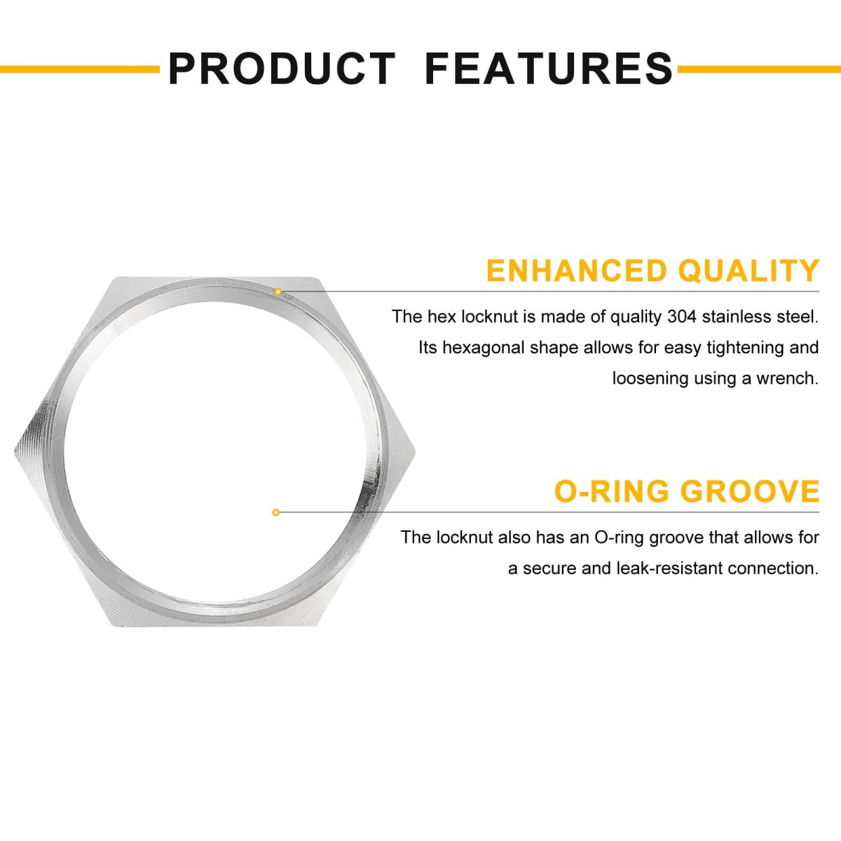 Size & Package: The package contains 4 pieces of hex locknuts and 4 pieces of plastic washer. The thread size is NTP 1", the hex locknut measures 36mm (1.42 inches) for outer diameter, and the washer measures the size for 34x39mm/1.34x1.54inch (IDxOD). Enhanced Quality: The hex locknut is made of quality 304 stainless steel. Its hexagonal shape allows for easy tightening and loosening using a wrench. The locknut also has an O-ring groove that allows for a secure and leak-resistant connection.. Practical Designed to Connect: The locknut provides a secure and reliable connection in pipe fittings with PT threads for creating tighter seals than straight threads. It helps prevent leakage and ensures the stability of the threaded connection.. Easy to Use: We have given you plastic washers to facilitate your installation. To use this locknut, thread it and the washer onto the corresponding male PT threaded pipe or fitting. Use a wrench to tighten them securely against the mating surface. Ensure proper alignment and threading engagement for optimal performance and sealing.. Wide Application: This locknut suits various applications in plumbing, industrial piping and other fluid handling systems. It can be used in residential and commercial settings where a reliable and leak-resistant connection is needed..Other fine products