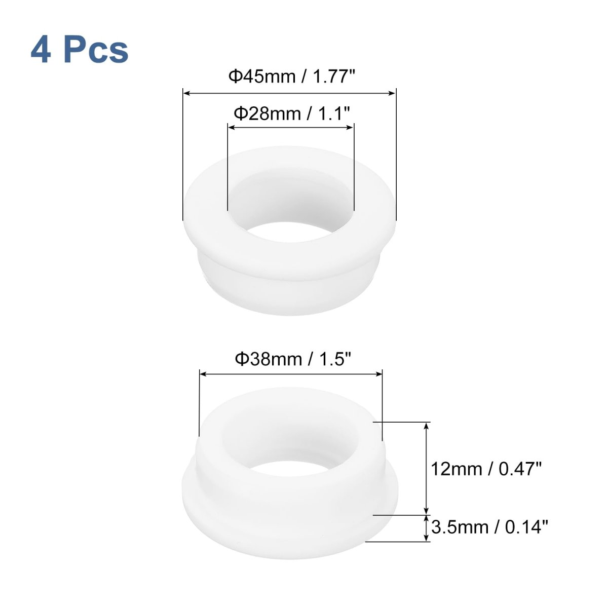 [Rubber Grommet] - Drill Hole: 38mm/1.5inch; Inner Dia.: 28mm/1.1inch; Upper Dia.: 45mm/1.77inch; Slot Height: 12mm/0.47inch; Upper Thickness: 3.5mm/0.14inch; Fit Hole Dia.: 38mm/1.5inch; Package Content: 4Pcs x Silicone Rubber Grommets. [Material] - The grommet is made of flexible and pressure-resistant silicone rubber, high temperature and low temperature resistance, dust-proof and flame-retardant, long service life, good softness, not easy to deform and crack during use. [Function] - Silicone rubber gaskets are usually used to protect or cover holes and protect pipes or wires from scratches and harm from rough corners or rough surfaces, safely and effectively clamping wires. [Wide Application] - These silicone rubber wire grommets are useful in many scenes, such as mechanical equipment, computer equipment, lighting equipment, electrical engineering, auto parts equipment, etc..Other fine products