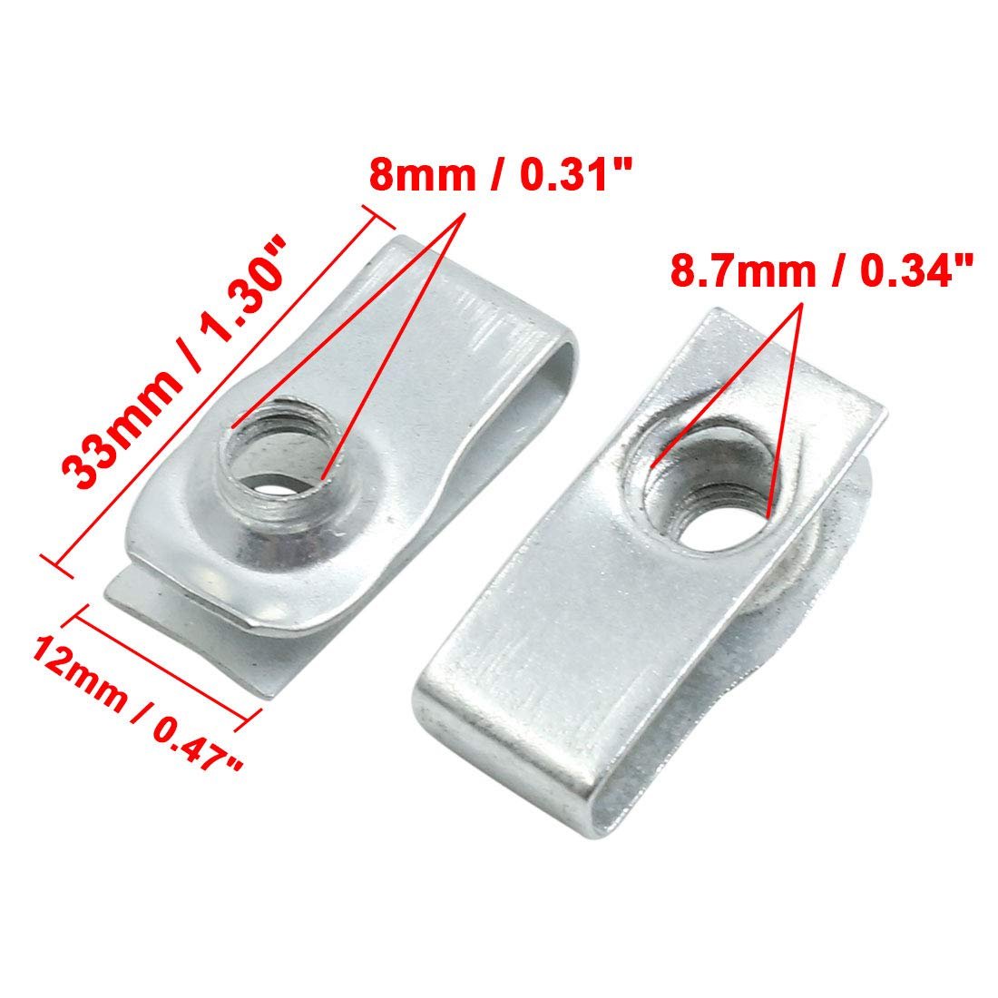 Clip Size: 33x12x7mm / 1.30"x0.47"x0.28"(L*W*H). Screw Size: 22x16.6mm / 0.87"x0.65"(L*D). They are pressed into a locked position over a panel edge and holds itself in position to receive a screw. Replace rusted or broken U clips to secure auto car body panel or. Used on door trims, roof linings, interior door panels, dashboards.Other fine products