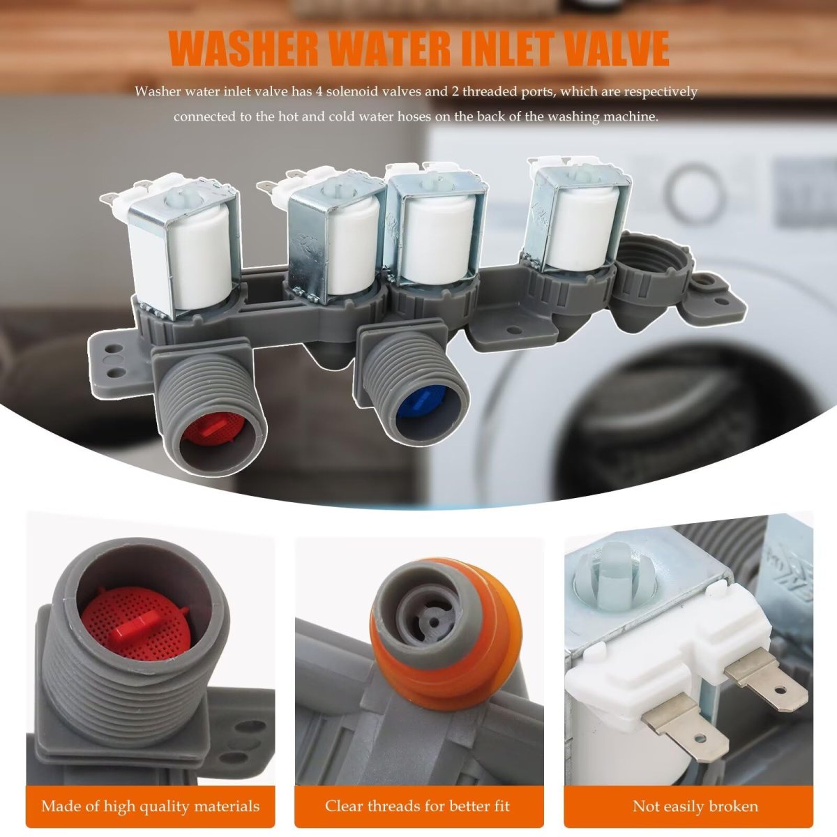 Fitment: 4-Solenoid Valve Water Inlet Assembly AJU75152602 for LG Washers, Solves Slow Filling/Leakage/Water Temperature Errors, with Dual Threaded Connections. Replacement Models: AJU75152602 washer water inlet replaces these parts: 5221EA1008S, 4873914, AP6335382, PS12580369, EAP12580369, PD00060681.. Compatible models: AJU75152602 Washer Inlet Valve Assembly is the correct replacement for the following model numbers: WT7405CW WT7305CV WT7305CW WT7150CW 31452 WT7250CW WT7880HWA WT7300CW WT7900HBA WT7060CV WT7800CW WT7300CV WT7060CW WT7100CW WT7800CV.. Purchase Matters: The AJU75152602 Water Inlet Valve Assembly has 4 solenoid valves and 2 threaded connections to the hot and cold water lines on the back of the washer, which help regulate the flow of water into the washer to ensure the proper level of water is present during each wash cycle for efficient wash results. Unplug the washer and turn off the water supply before installing the 5221EA1008S washer water inlet valve. Wear work gloves to protect your hands.. Fix the following symptoms: Our PS12580369 Washer Inlet Valve can solve your following problems: 1. The washing machine takes a long time to fill with water; 2. The washing machine has abnormal water inlet or water leakage; 3. The washing machine does not run; 4. Water temperature error..Other fine products