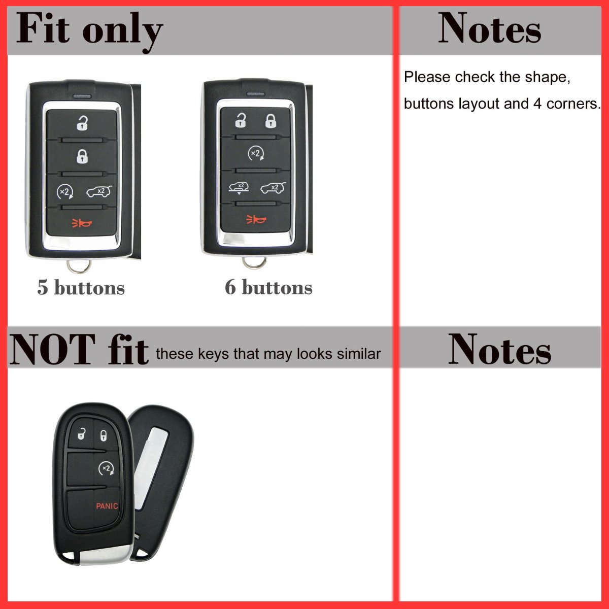 [Perfect Solution]The key fobs are very expensive to replace. This product offers a simple solution to protect, distinguish, and prevent broken & scratched up key fobs. Great protecting the fob case and all buttons,reduce push the button by accident,not interfere with the signal.. [Fit]Direct compatible with 5 buttons Jeep Grand Cherokee Grand Wagoneer 2021 2022. As long as it looks same with our key fob(shape, button layout, coners), then buy with confidence.. [Buyer's reviews]: "It's a rubberized sleeve but very smooth on the outside so it doesn't get caught up in jean pockets" "keys never get lost, my wife can easily locate her keys in her crowded purse" "I've had it for a while and have not noticed any wear or tear." "They fit snugly and allow the buttons & remote connections to work very well feels great" "Ordered the blue and pink one so my daughter and I fobs wouldnt get mixed up" "A small price to pay for keeping my fob pristine underneath". [Durable & Worry Free] silicone is very durable, you can use it for years, our silicone cover provide solid button signs for every key buttons, never worn off like the painted sign. super easy install,10 seconds to slide it in. [Professional]Not like other brands, we have been produce silicone case for more than 10 years, after testing for more than a hundred times, we find the best material and parameter for the silicone key cover, the silicone is slim enough to fit nice and snug, and thick enough to cushion your fob from accidental dropping..Other fine products