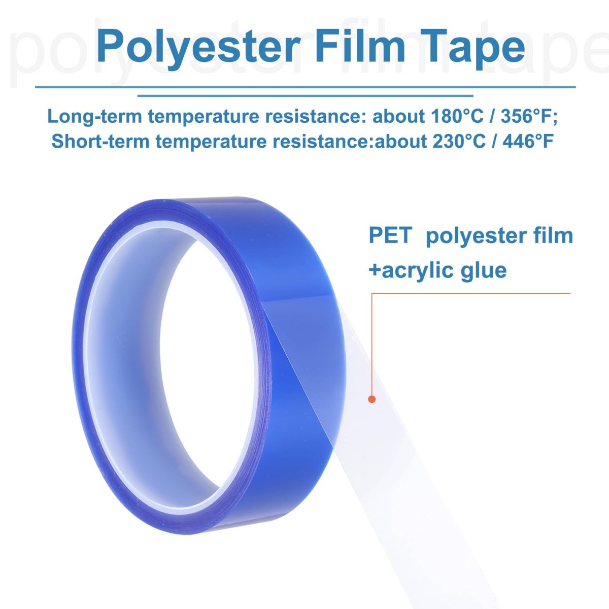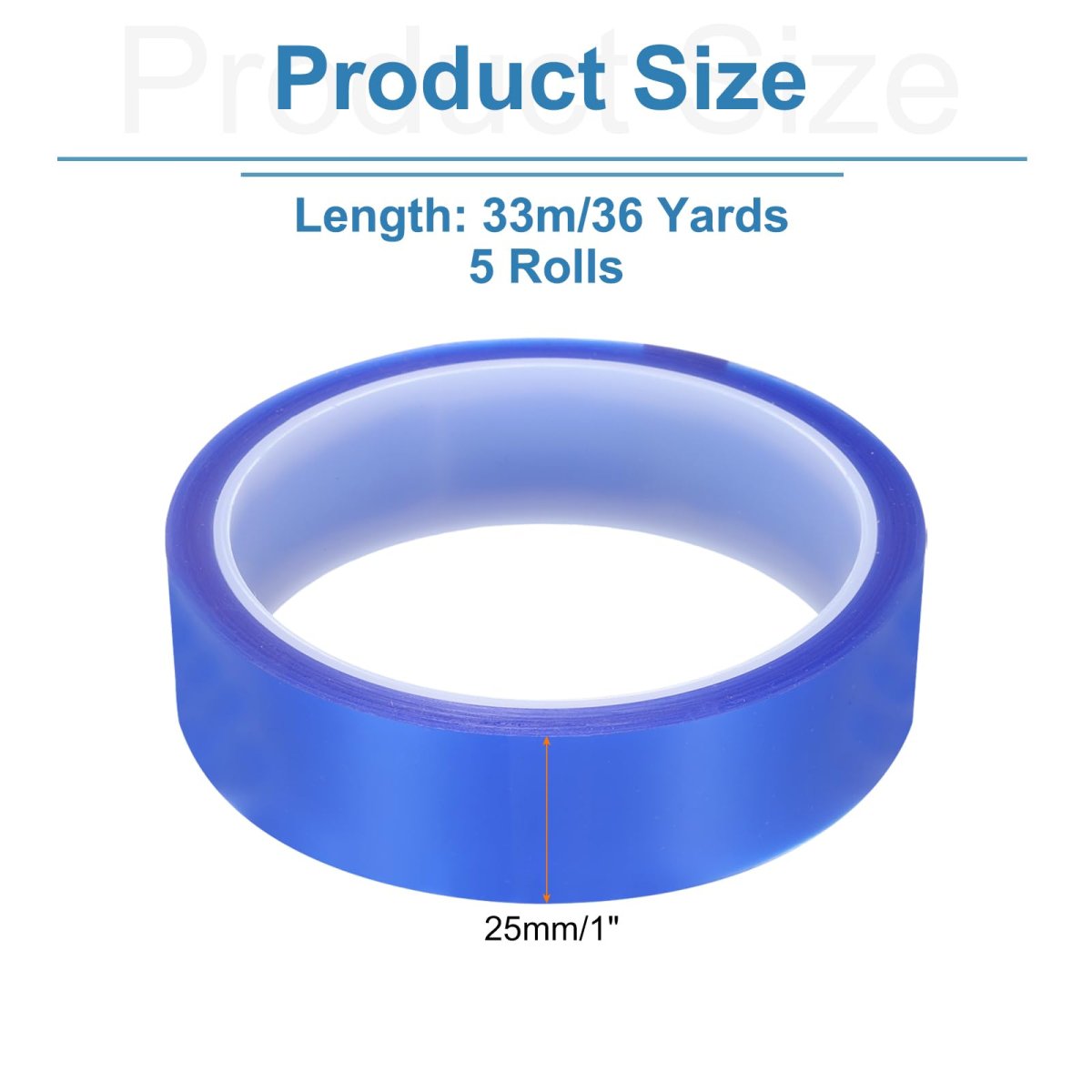 Heat-resistant tape polyester film tape. Adhesive made of acrylic acid, high viscosity, waterproof, not easy to corrode and age, single-sided self-adhesive design, no residue, easy to use, with excellent electrical insulation performance and high temperature resistance.. Color:Blue;Width: 25mm/1 Inch;Length: 33m/36 Yards;Thickness: about 0.06mm/0.002inch;Long-term temperature resistance: about 180C / 356F;Short-term temperature resistance:about 230C / 446F;Type: One-side self-adhesive design;Material: PET;Package Content:5 Rolls x PET Tape;. high temperature tape is very suitable for protecting electronic products and can be used for sensitive printed circuit board (PCB) components such as circuit board repair, welding, 3D printing, etc. Widely used as high temperature tape for transformers, motors, coils, capacitors and variable frequency power supplies in the electronics industry.. The surface of the tape is wear-resistant and pull-resistant, not easy to break and deform, and it is not easy to leave residual glue after tearing; therefore, it is also suitable for marking and positioning on workbenches, desktops, and floors.. Colored pet tape 5S desktop identification positioning tape is also suitable for ground area division, drawing board table application, park venue use, manual production use, shelf classification use, wall graphic DIY.Other fine products