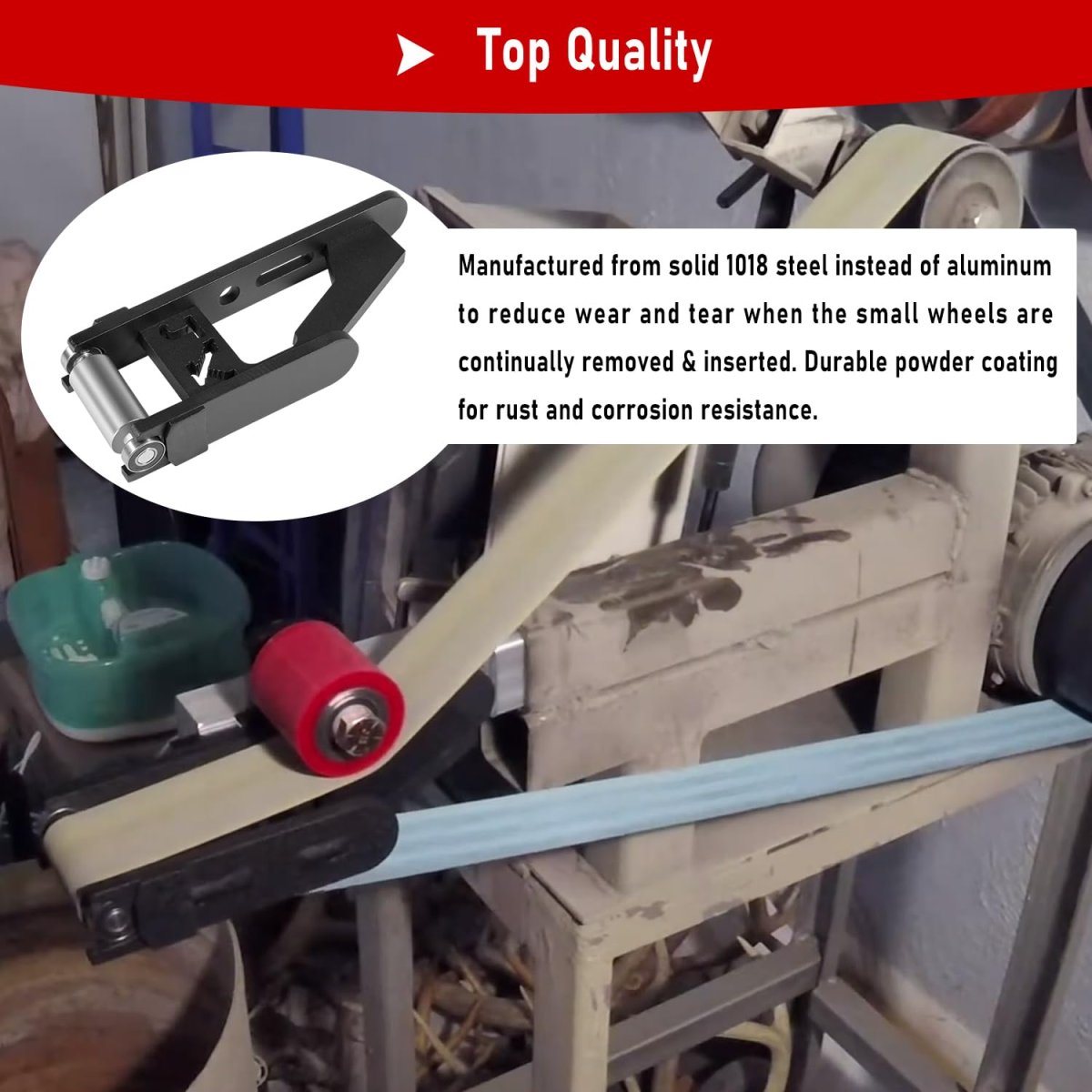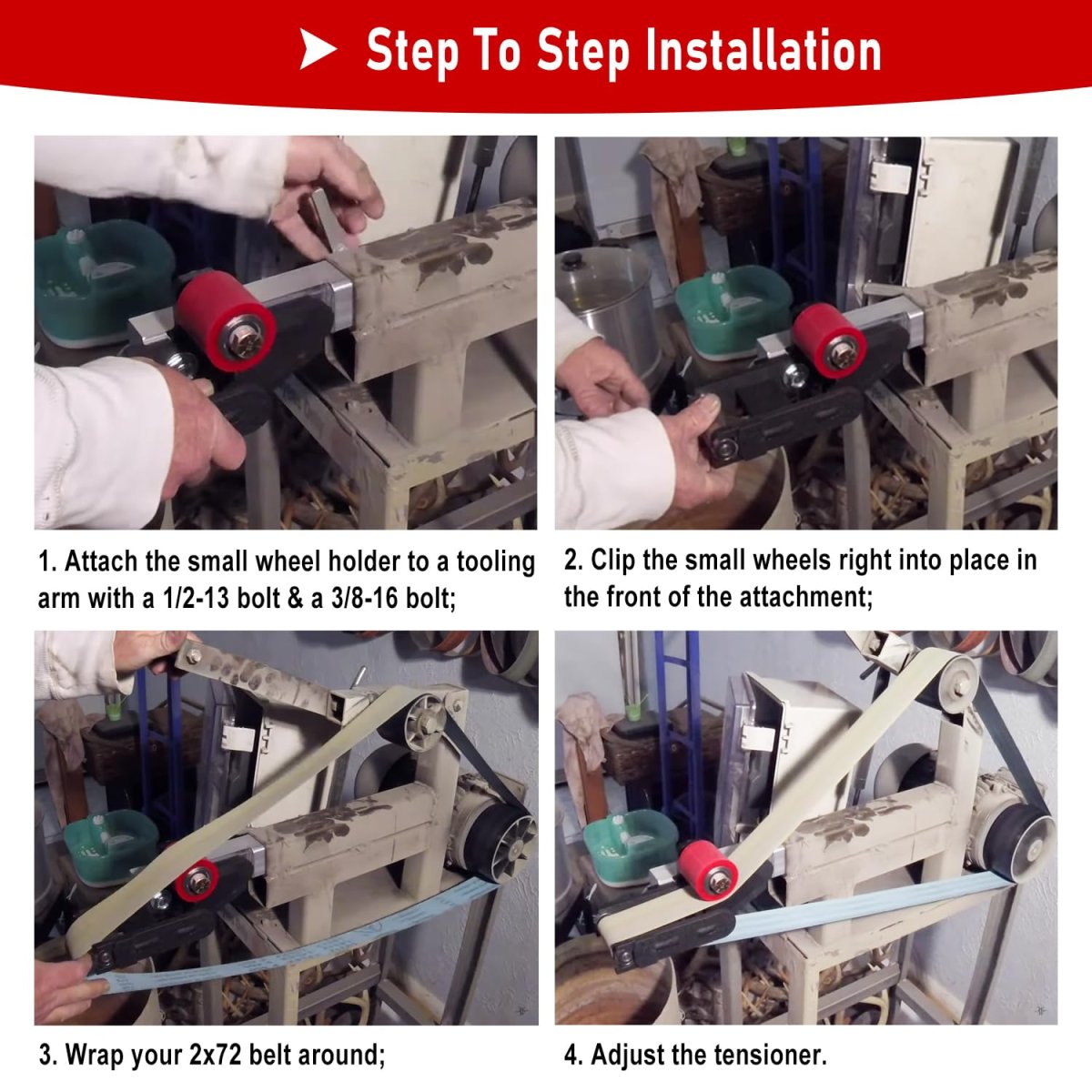 APPLICATION -- Steel small wheels & holder kit will fit many different makes of tooling arms/272 belt grinders. Suitable for most belt sanders.. EASY INSTALLATION -- Attach the small wheel holder to a tooling arm with a 1/2-13 bolt & a 3/8-16 bolt. Then clip the small wheels right into place in the front of the attachment. Wrap your 2x72 belt around. Adjust the tensioner.. ADVANTAGE -- Includes 5 different sized small wheels (1/2, 5/8, 3/4, 7/8, 1) help grind all the small areas efficiently, give you very nice looking finger grooves and notches on your knives. A must have item for knife makers.. -- Manufactured from solid 1018 steel instead of aluminum to reduce wear and tear when the small wheels are continually removed & inserted. Durable powder coating for rust and corrosion resistance.. PACKAGE INCLUDES -- Included are 5 small wheels: 1/2, 5/8, 3/4, 7/8, 1; and one small wheel holder with bolts..