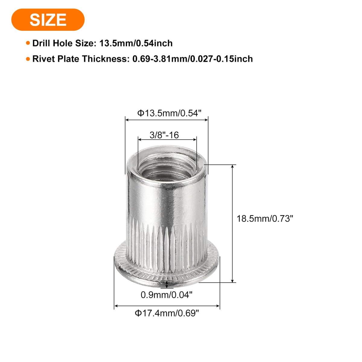Specification: Material: Stainless Steel 304; Thread Size: 3/8"-16; Total Length: 18.5mm/0.73inch; Head Diameter: 17.4mm/0.69inch; Body Diameter: 13.5mm/0.54inch; Head Height: 0.9mm/0.04inch; Drill Hole Size: 13.5mm/0.54inch; Rivet Plate Thickness: 0.69-3.81mm/0.027-0.15inch; Package Content: 50Pcs x Rivet Nuts. [Materials]: Rivet nuts are crafted from durable 304 stainless steel, providing excellent resistance to rust and corrosion, ensuring extended service life. Their non-fading, anti-oxidation properties maintain their appearance, while their robust construction resists deformation.. [Features]: Our rivet nuts feature knurls with flat, deep threads for easy installation and slip resistance. Rivet nuts are fasteners used to join thin materials that cannot be threaded. They can be installed using a tool that distort the nut, creating a secure connection around the hole.. [Easy to use]: Rivet nuts require riveting tools, either pneumatic or manual. Create a hole matching the rivet nut's mounting hole size, insert the rivet nut, and use the riveting tool to secure the locking nut.. [Application]: Rivet nuts are commonly used in metal fabrication industries, including metal sheets and pipes. They are also widely used in the assembly of products such as cars, aircraft, trains, refrigeration equipment, switches, instruments, furniture, elevators, and decorative items..Other fine products