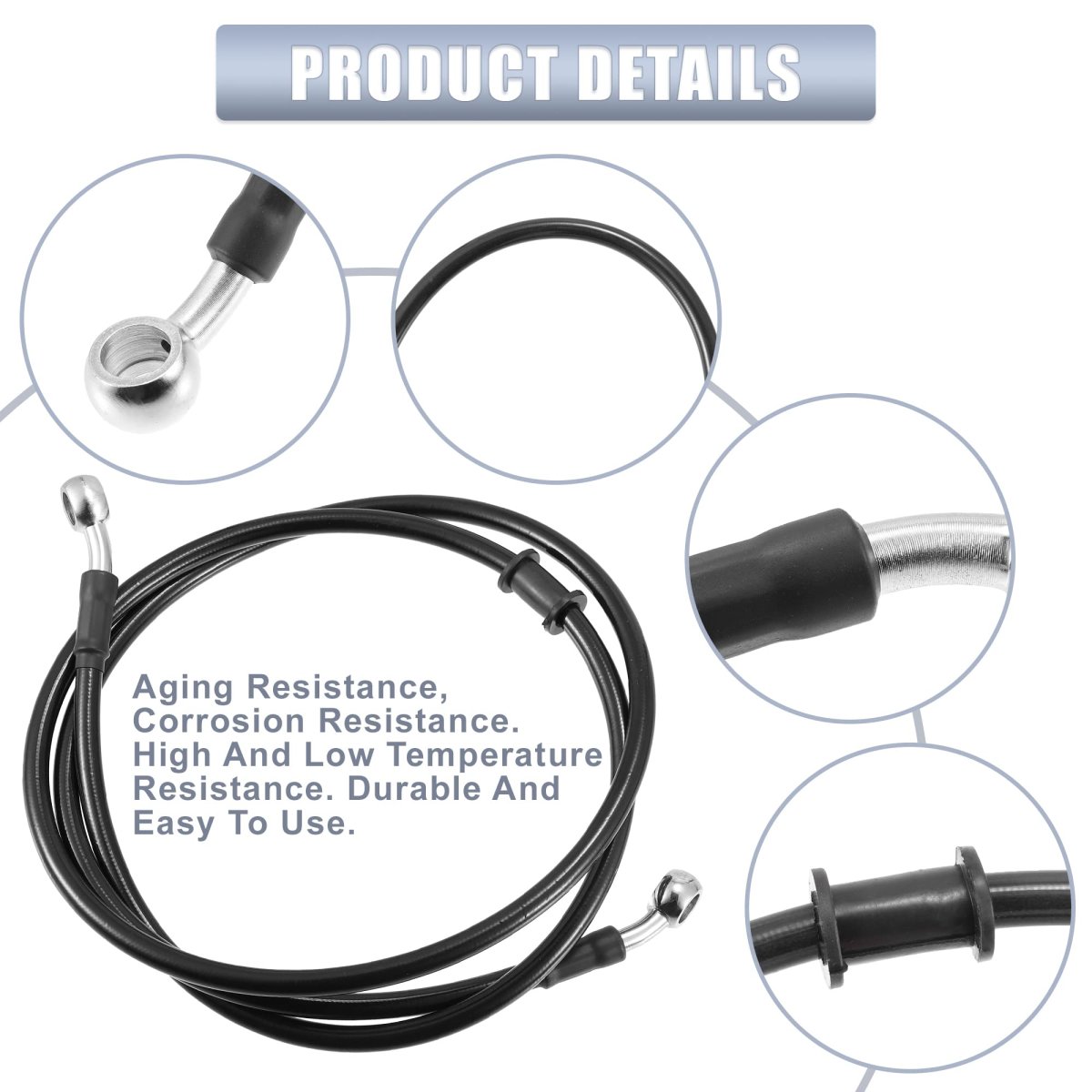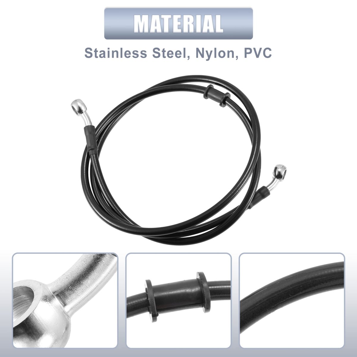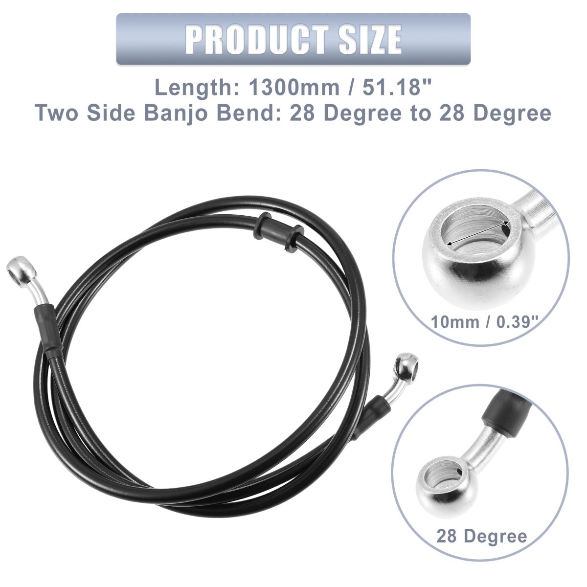 Color: Black, Material: Rubber, Stainless Steel, Alloy. Banjo Inner Diameter: 10mm / 0.39", Length: 1300mm / 51.18", Two Side Banjo Bend: 28 Degree to 28 Degree. Application: These braided brake lines provide brake pressure to the brake calipers, improve brake sensitivity and braking force, and effectively shorten the braking distance.. Material: The clutch oil hoses are made of good quality Rubber, Stainless Steel, Alloy, to ensure durability and safety, heat resistant, anti aging, waterproofing, anti corrosion.. Installation: Easy to install, just direct fit it in your engine, our front braided stainless steel gas clutch pipe provides easy installation and use.. Package Includes: 1 x Black 51.18" Motorcycle Brake Hose Oil Line Pipe.Other fine products