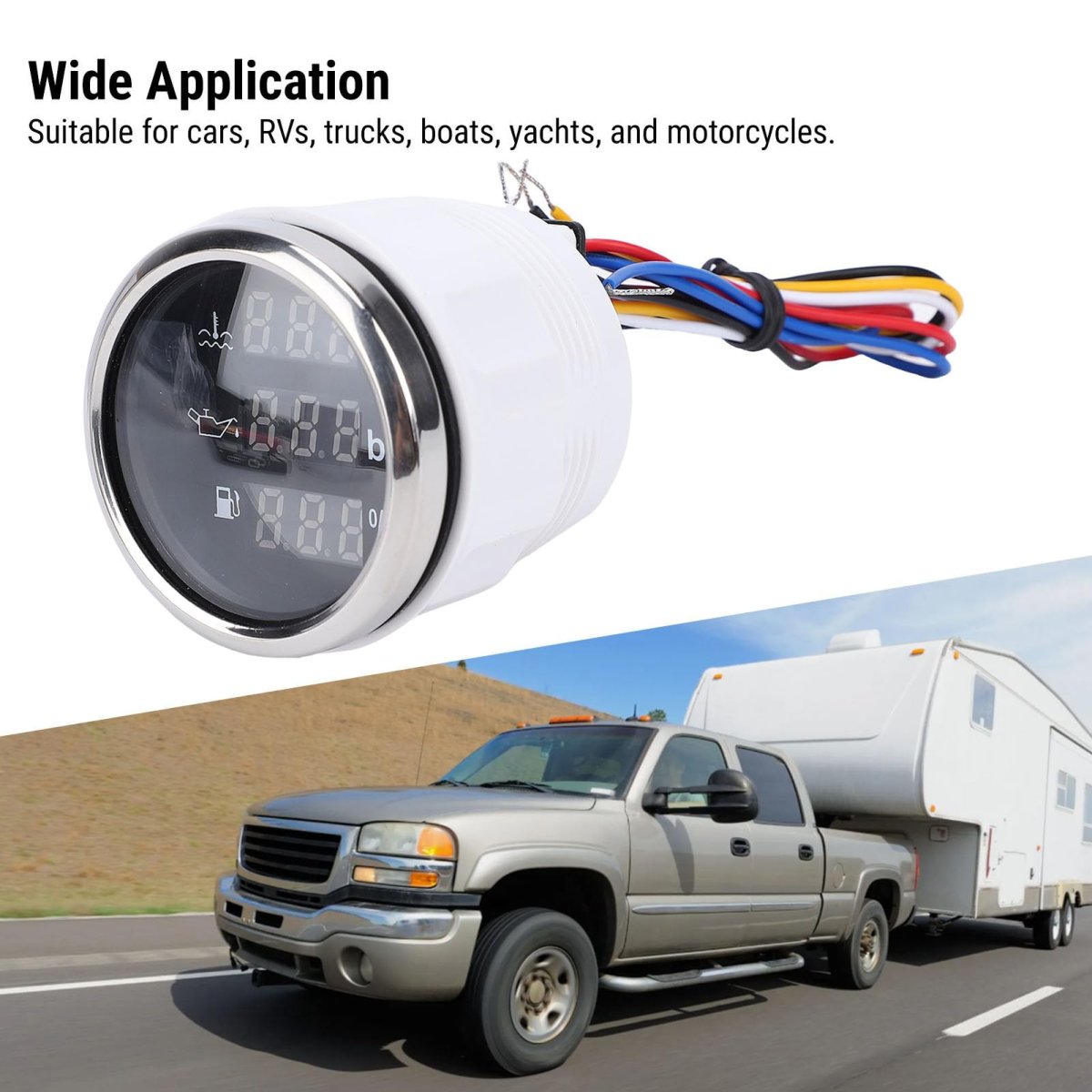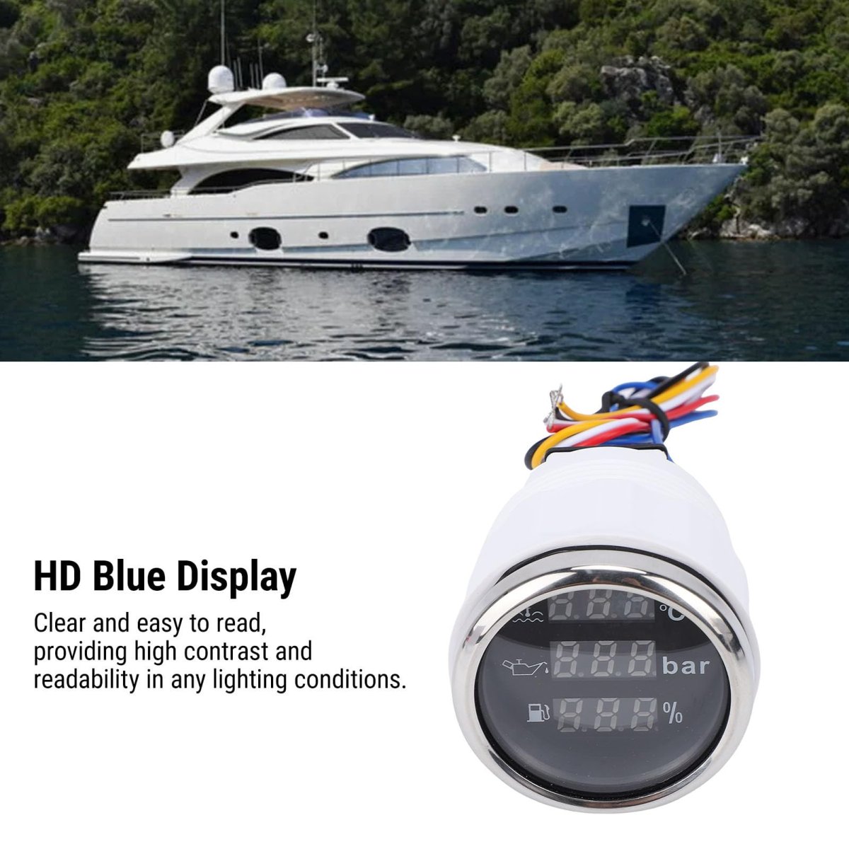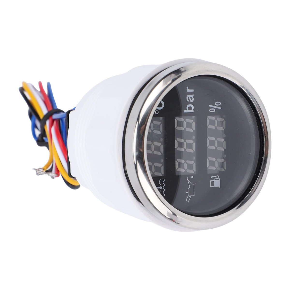 3-in-1 Functionality: The 52mm Fuel Level Oil Pressure Water Temp Meter combines three essential monitoring features into one compact unit. This digital display meter offers insights into water temperature, oil pressure, and fuel level for effective management of your vehicle, RV, or boat.. Universal Compatibility: Designed to operate with both 12V and 24V electrical systems, this meter is suitable for a wide range of vehicles and equipment. Its straightforward installation process ensures that you can quickly integrate it into your existing setup.. HD Blue Display: Featuring a vibrant blue digital display, this meter ensures clear visibility and high contrast for easy reading in various lighting conditions. Whether in bright sunlight or darkness, you can rely on this meter for accurate and immediate information.. Robust Construction: Made from a combination of ABS and 316 stainless steel, this meter is designed to withstand the challenging conditions of automotive and marine environments. Its strong construction enables it to deliver consistent performance during your adventures..Other fine products