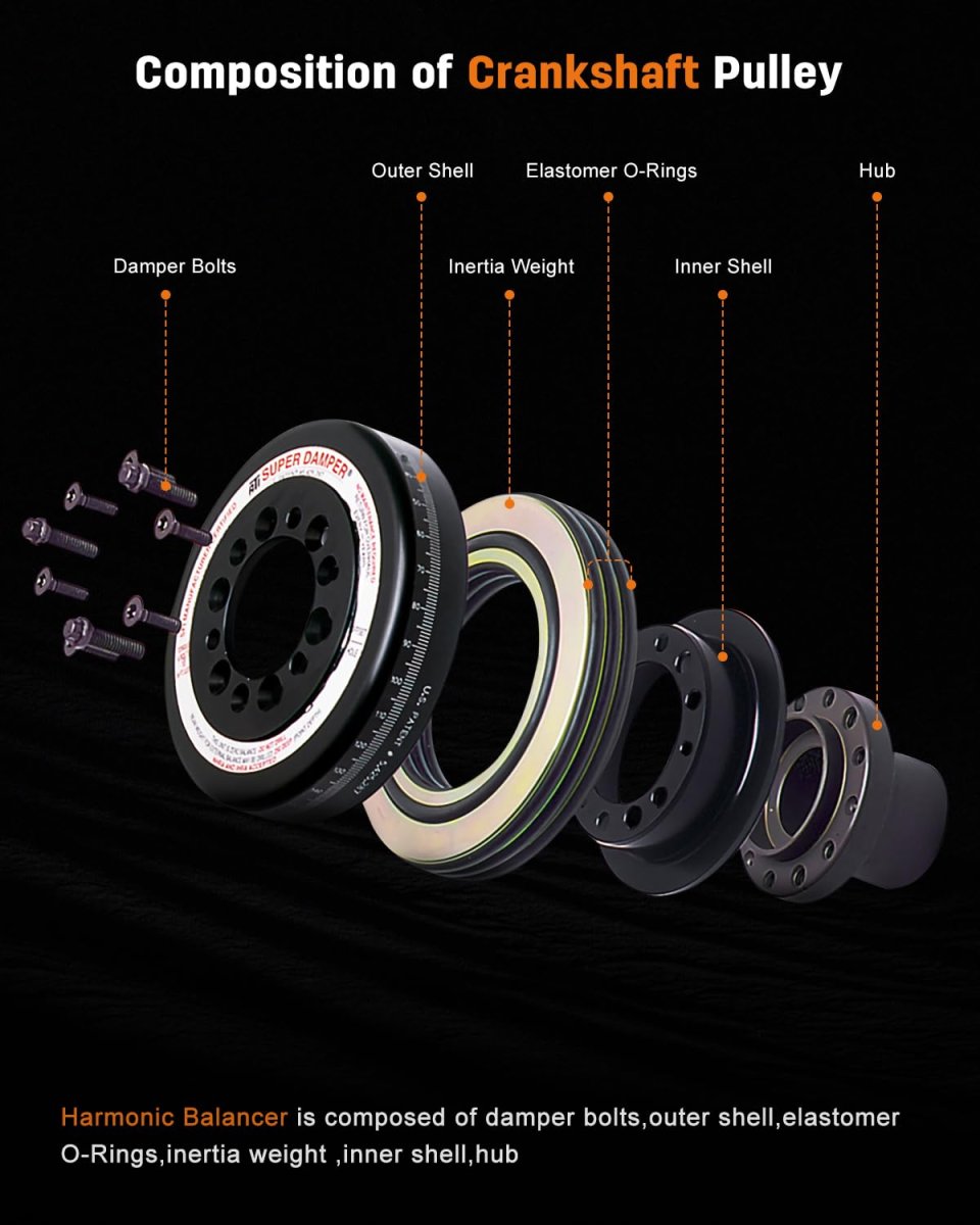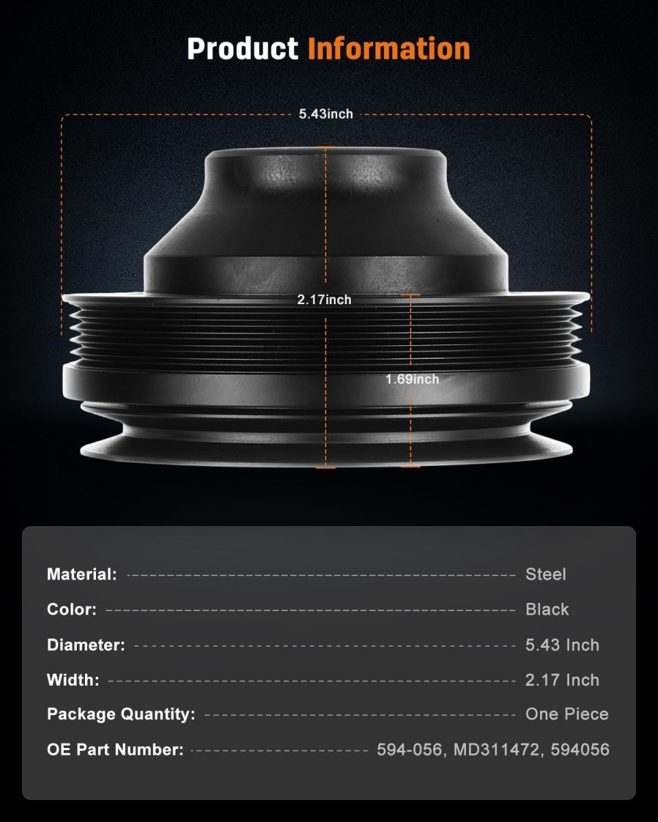 Compatible For Mitsubishi Model:1997-2003 For Mitsubishi Montero Sport V6 3.0L,1999-2004 For Mitsubishi Montero Sport V6 3.5L,1995-1996 For Mitsubishi Montero V6 3.0L,1994-2000 For Mitsubishi Montero V6 3.5L. Replace OE Numbers:594-056, MD311472, 594056;Mounting Hole Quantity: 1;Diameter:5.43 Inches;Width:2.17 Inches. Premium Construction:Our Harmonic Balancer Pulley meets TS16949 standards, using ductile steel and high-grade rubber for superior durability under extreme conditions.. Vibration Reduction:The Engine Harmonic Balancer features rubber-bonded steel construction that effectively dampens engine vibrations for smoother operation and reduced wear..Other fine products