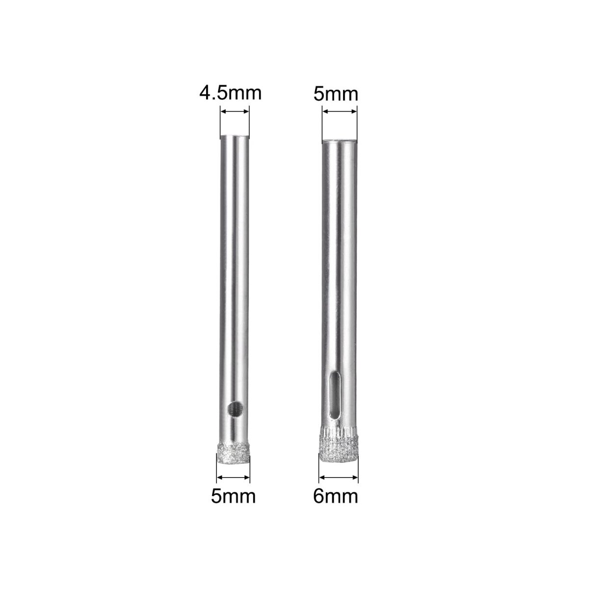 Size - 5mm Drilling Diameter, 4.5mm Shank(10pcs); 6mm Drilling Diameter, 5mm Shank(10pcs). Diamond Coated - Diamond coating enhances the drilling speed, which makes the bit sharper.. Nickel Plated Surface - The nickel plating surface can extend the service life and enhance surface corrosion resistance.. Special Design - Side open can remove the waste to keep the drill bit clean.. Applications - Perfect for drilling glass, ceramics, porcelain, ceramic tile, porcelain tile, limestone, slate, marble, light stone and fiberglass. (Need to be used at a low speed; Always use lubrication (water) when processing, otherwise the hole saw will burn.).Other fine products