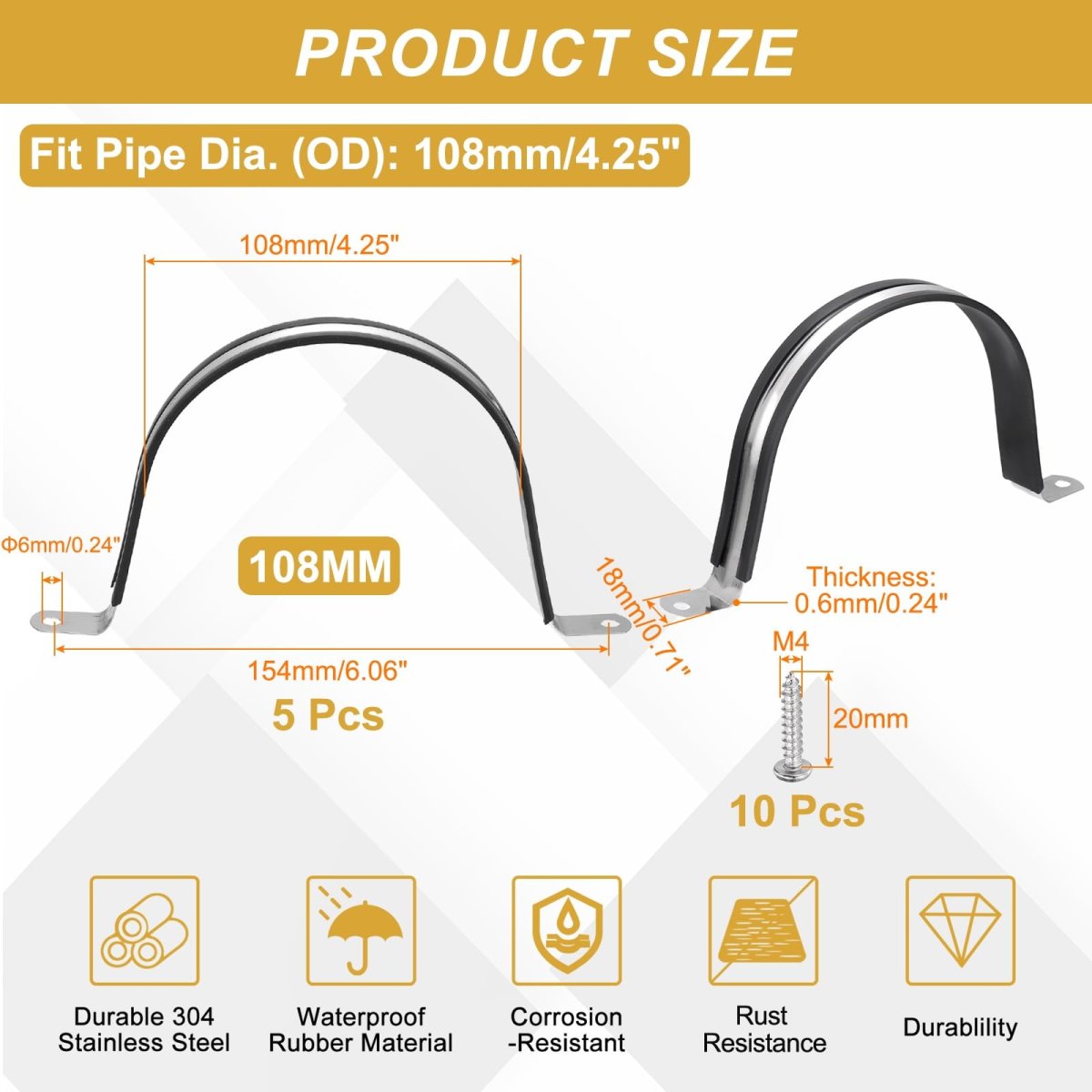 Material: 304 Stainless Steel, EPDM Rubber; Stainless Steel Clamp Width: 18mm/0.71"; Fit Pipe Dia. (OD): 108mm/4.25"; Thickness: 0.6mm/0.24"; Hole Dia.: 6mm/0.24"; Hole Spacing: 154mm/6.06"; Screws Size(DiaxL): M4x20mm; Package Contents: 5 Pcs x Cable Clamps, 10 Pcs x Screws. Durable Material: The cable clamp is crafted from 304 stainless steel and EPDM rubber cushioned pads for durability, it is oil-proof, waterproof, anti-oxidation, rust and corrosion-resistant, and the elastic rubber material provides effective buffering and insulation properties.. U-Tube Design: The U-Tube opening design facilitates easy attachment of pipe clamps to surfaces. The U-style curvature and rubber pad offer stable support for securing the pipe, safeguarding cables and pipes, minimizing wear, and extending the service life of the pipes.. Application: These cable clamps have a wide range of applications and are used in automotive, industrial, marine, home, construction, and other area. Commonly used for line management and maintenance. Suitable for stainless steel pipes, rubber hoses, plastic steel pipes, gas pipes, indoor and outdoor fixing of wires and cables..Other fine products
