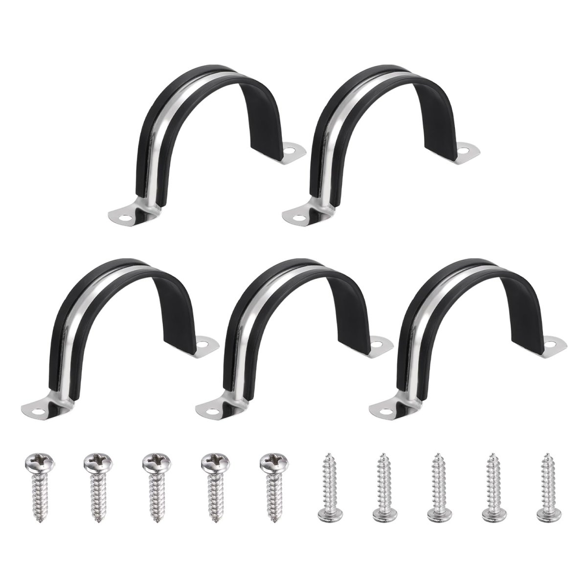 Material: 304 Stainless Steel, EPDM Rubber; Stainless Steel Clamp Width: 18mm/0.71"; Fit Pipe Dia. (OD): 57mm/2.24"; Thickness: 0.6mm/0.24"; Hole Dia.: 6mm/0.24"; Hole Spacing: 95mm/3.74"; Screws Size(DiaxL): M4x16mm; Package Contents: 5 Pcs x Cable Clamps, 10 Pcs x Screws. Durable Material: The cable clamp is crafted from 304 stainless steel and EPDM rubber cushioned pads for durability, it is oil-proof, waterproof, anti-oxidation, rust and corrosion-resistant, and the elastic rubber material provides effective buffering and insulation properties.. U-Tube Design: The U-Tube opening design facilitates easy attachment of pipe clamps to surfaces. The U-style curvature and rubber pad offer stable support for securing the pipe, safeguarding cables and pipes, minimizing wear, and extending the service life of the pipes.. Application: These cable clamps have a wide range of applications and are used in automotive, industrial, marine, home, construction, and other area. Commonly used for line management and maintenance. Suitable for stainless steel pipes, rubber hoses, plastic steel pipes, gas pipes, indoor and outdoor fixing of wires and cables..Other fine products