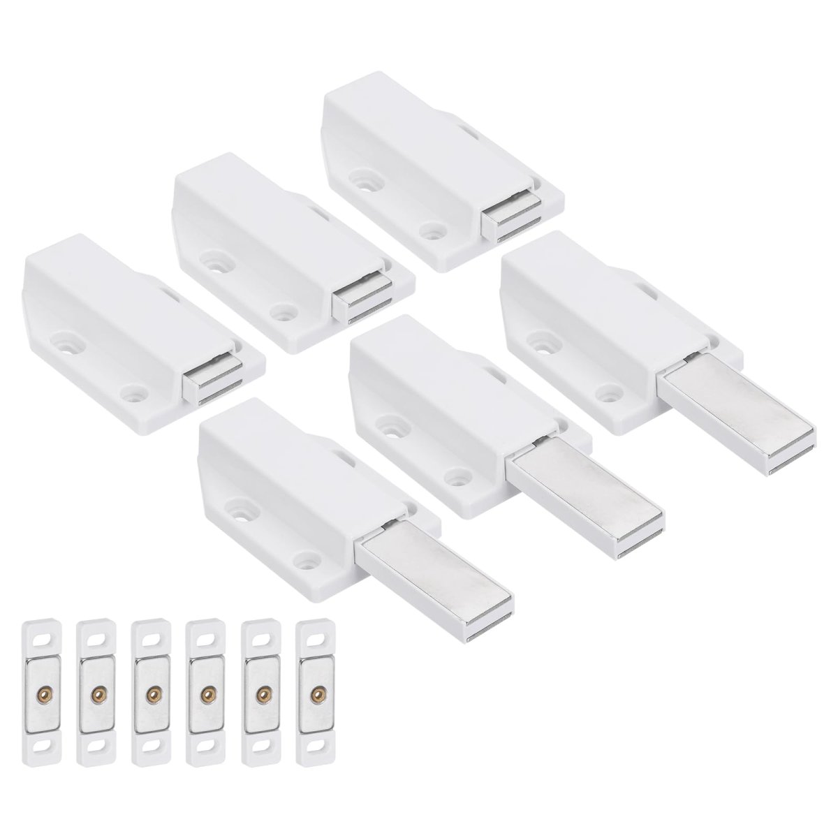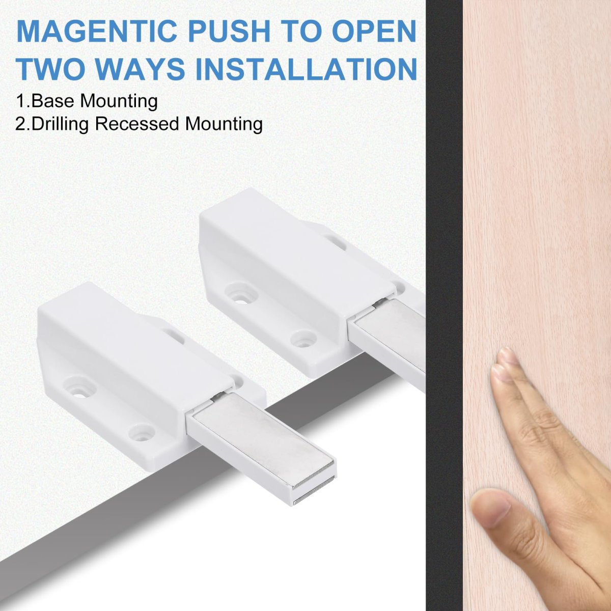 What you get: You will get 6 Pcs of Magnetic Push Latch, which made of Plastic and color is White. The Latch length is 76 mm / 3 inch, width is 46 mm / 1.81 inch, height is 12 mm / 0.47 inch.. Material: Made of Good-Quality base and durable spring mechanism ensures anti-rust and corrosion resistance, making it a timeless choice for medium-sized doors.. Design: Our push to open system is designed with snaps at the tail and head of the base, which makes the latches more stable and not easy to fall off.. Easy to Use: Built-in spring-loaded plunger, you can just simply press the door to latch. Eliminates the need for handles or knobs. Create the clean, seamless look of no knobs. Suitable for use with hinges without self-closing feature.. Secure Closure: Our push to open system features a long-stroke design with a built-in magnet that ensures a secure close point, preventing "drifting open" doors. You can rotate the magnetic tip of the inner core left or right to adjust its extra extension length of 2-9 mm to fit the gap of the door..Other fine products