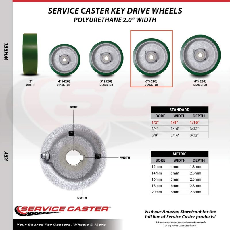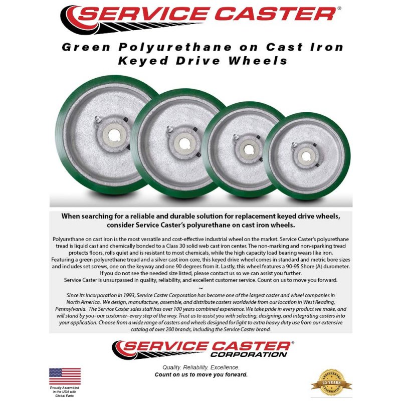 Service Casters Green Polyurethane on Silver Cast Iron core wheels come in four different wheel sizes 4 x 2", 5" x 2", 6" x 2", and 8" x 2".. Weight capacity: 925 lbs. per wheel (Weight capacity can vary depending on load, torque, speed, duty cycle, environment, and coefficient of friction). Three different bore sizes are available - 1/2" (1/8" W x 1/16" D Keyway), 5/8" (3/16" W x 3/32" D Keyway), and 3/4" (3/16" W x 3/32" D Keyway). All wheel sizes have a 2-3/16" hub length. The hub length is the widest point of the wheel, so it is important to ensure you can accommodate this width before purchasing.. Polyurethane on cast iron is the most versatile and cost-effective industrial wheel on the market. Service Casters polyurethane tread is liquid cast and chemically bonded to a Class 30 solid web cast iron center. The non-marking and non-sparking tread protects floors, rolls quiet and is resistant to most chemicals, while the high capacity load bearing wears like iron. Finally, featuring a 90-95 Shore (A) durometer, this wheel is a great option for anyone looking for a keyed drive wheel..Other fine products