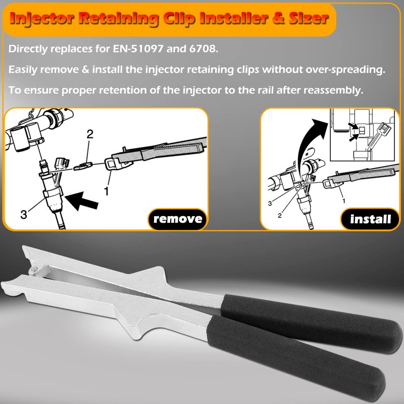 ApplicationsCompatible with 2013-Newer GM vehicles with 4.3L V6, 5.3L V8 or 6.2L V8. Fits for 2014-2015 Chevrolet Silverado and for GMC Sierra V6 and V8 engines; Fits for 2015 Chevrolet Suburban Tahoe and for GMC Yukon XL V8 engines; Fits for 2014 Chevrolet Corvette V8 engines; Fits for 2015 Cadillac Escalade V8 engines.. High PerformanceSpecially designed to easily & properly remove and install the injector retaining clips for select GM vehicles without over-spreading, to ensure proper retention of the injector to the rail after reassembly. Comparable to OEM part number 6708 EN-51097 both in quality and functions.. Easy OperationEN-51097 Injector Retaining Clip Replacer is a pliers-type tool to fit into the injector clip, and limit the amount of spread during both removal and installation. For removal, EN-51097 fits between the clip and the injector, and opens the clip to remove it from the assembly. For installation, a clip is placed into EN-51097, spread, and placed over the injector. EN-51097 is closed, and removed from the injector rail assembly.. Superior MaterialMade from STEEL and RUBBER, comfortable handle grip, high strength, great wear resistance, prevent from rust and corrosion, sturdy and durable, ensures long term reliable service..Other fine products