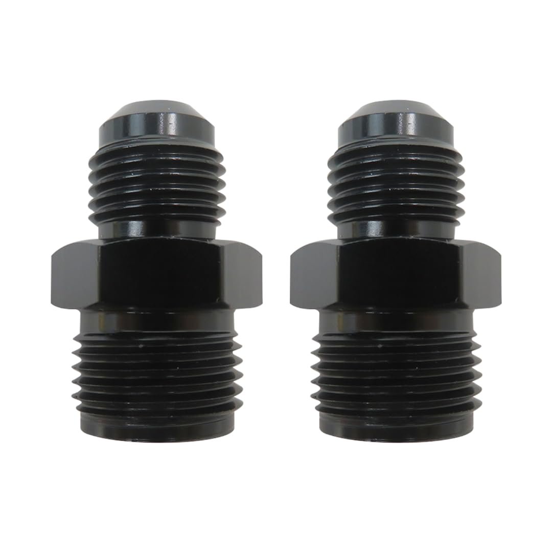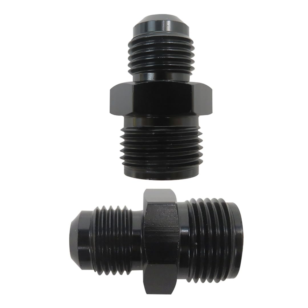 Black Power Steering Fitting Made of Aluminum alloy 6061-T6 Material, anodized black surface.. Size: 6AN Male to 5/8-18; 6AN Male to 11/16-18.. 6AN 5/8-18: The thread size of 6AN is (9/16-18) UNF, male thread 5/8x 18 inverted, the AN flare side is sealed by a 37 degree angle. Widely used in fuel systems and cooler systems, etc.. 6AN 11/16-18: This adapter fitting is commonly used to adapt power steering boxes to AN 6 connections. 11/16"-18 inverted flare male on one end and AN6 male on the other. Inverted flare fittings are used on most for GM power steering boxes 1977 and older. Metric thread O-ring fittings are used on later model for GM power steering boxes 1978 and newer. Zinc plated for corrosion resistance.. Package Includes: 1x 6AN Male to 5/8-18 Power Steering Fitting; 1x 6AN Male to 11/16-18 Power Steering Fitting..Other fine products