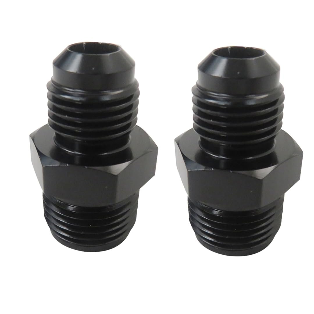 Black Power Steering Fitting Made of Aluminum alloy 6061-T6 Material, anodized black surface.. Size: 6AN Male to 5/8-18; 6AN Male to 11/16-18.. 6AN 5/8-18: The thread size of 6AN is (9/16-18) UNF, male thread 5/8x 18 inverted, the AN flare side is sealed by a 37 degree angle. Widely used in fuel systems and cooler systems, etc.. 6AN 11/16-18: This adapter fitting is commonly used to adapt power steering boxes to AN 6 connections. 11/16"-18 inverted flare male on one end and AN6 male on the other. Inverted flare fittings are used on most for GM power steering boxes 1977 and older. Metric thread O-ring fittings are used on later model for GM power steering boxes 1978 and newer. Zinc plated for corrosion resistance.. Package Includes: 1x 6AN Male to 5/8-18 Power Steering Fitting; 1x 6AN Male to 11/16-18 Power Steering Fitting..Other fine products