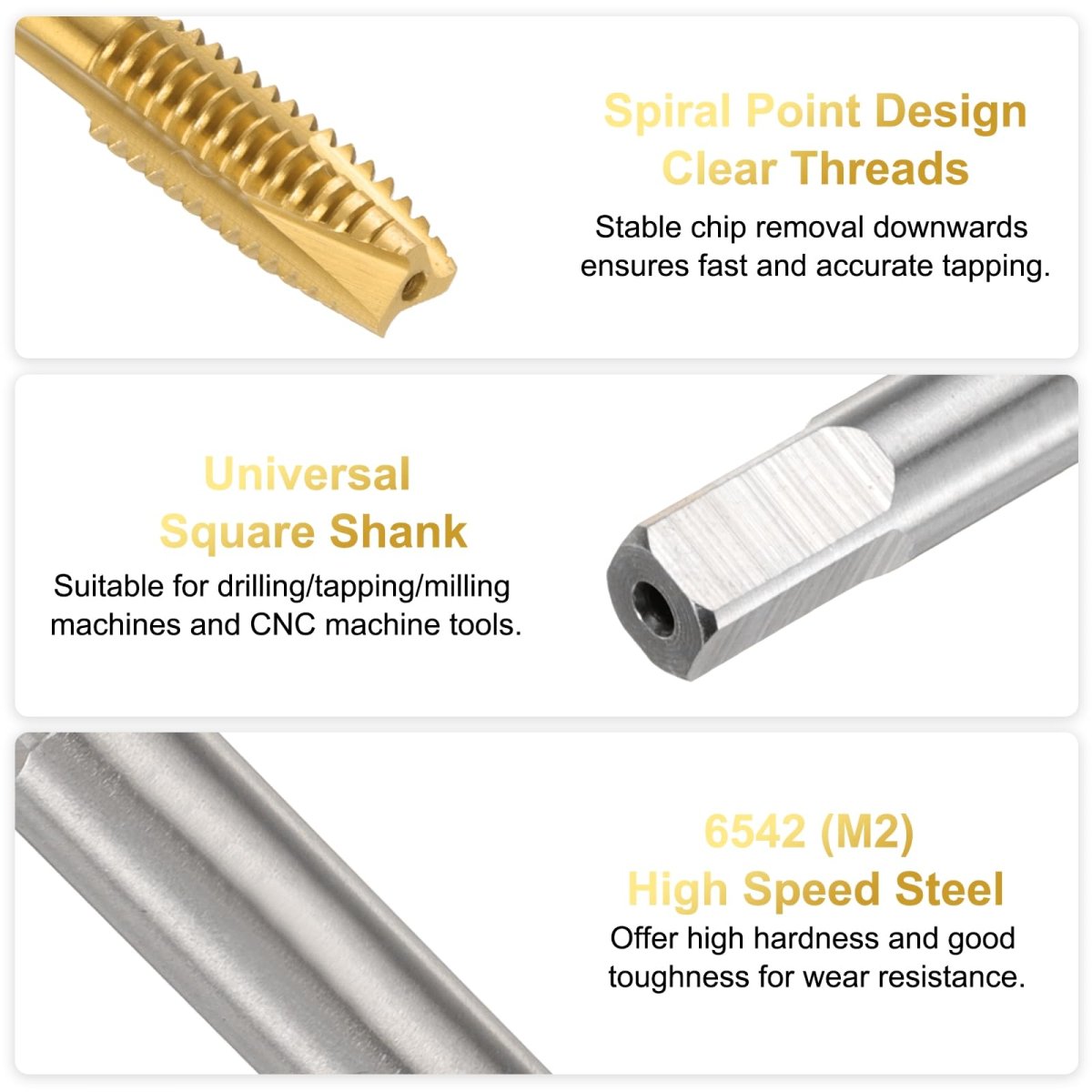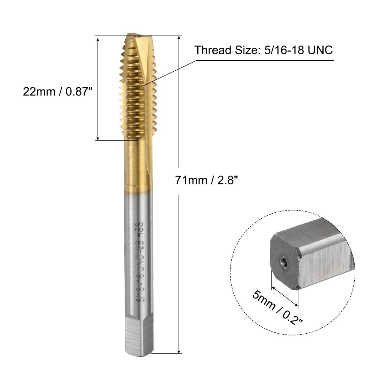 Spiral Point Tap Size: Thread Size: 5/16-18 UNC, Shank Side Width: 5mm / 0.2 inch, Thread Length: 26mm / 1 inch, Total Length: 71mm / 2.8 inch, Accuracy: B2. 6542 (M2) High Speed Steel: Made of high-speed steel, the tapping bit has high hardness, toughness and wear resistance, and can stably remove chips during cutting. Titanium-plated threading taps can improve corrosion and oxidation resistance, extending service life, which is very suitable for a wide range of applications.. Features: Thread tapping bit features spiral point, plug chamfer and right hand thread cutting. Straight groove taps can remove chips downward, with clear threads and sharp cutting edges, ensuring fast and accurate tapping. The grooves on the tap facilitate the removal of chips and debris from the hole.. Applications: Screw tap can be used for drilling and tapping of stainless steel, aluminum, cast iron, alloy steel, ordinary steel, non-ferrous metals, hard plastics, etc. Suitable for drilling machines, tapping machines, CNC machine tools and milling machines. Use with tapping oil to improve processing accuracy and reduce the probability of breakage.. Tips: It is recommended to use a machine tap with a tap chuck with overload protection function. The tapping angle should be 90 degrees vertical and stable, and the tapping depth should not exceed 1.5 times the tap diameter..Other fine products