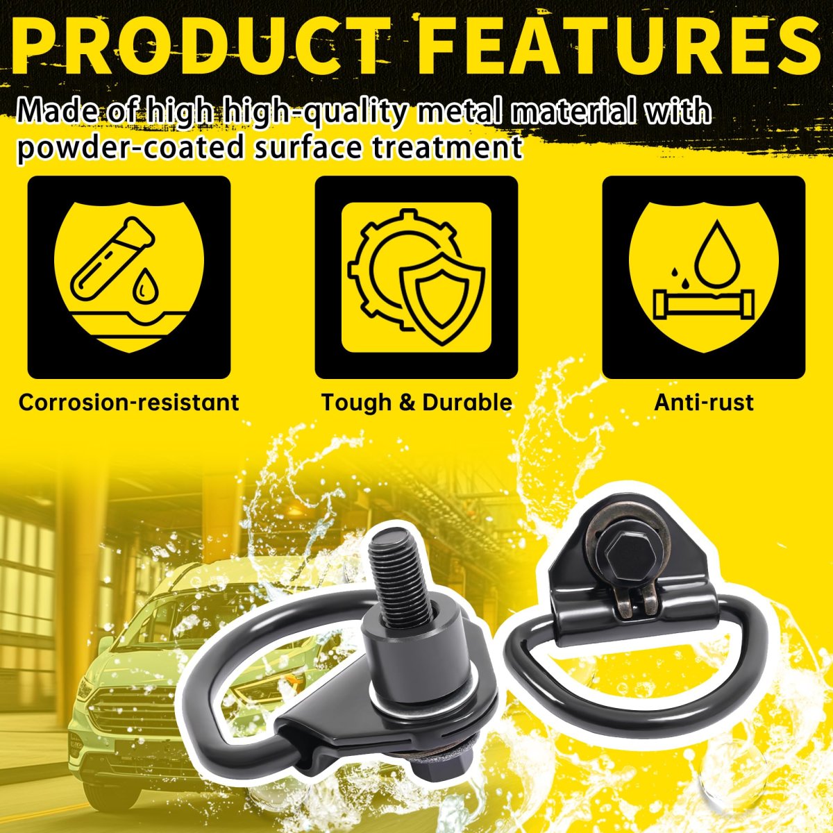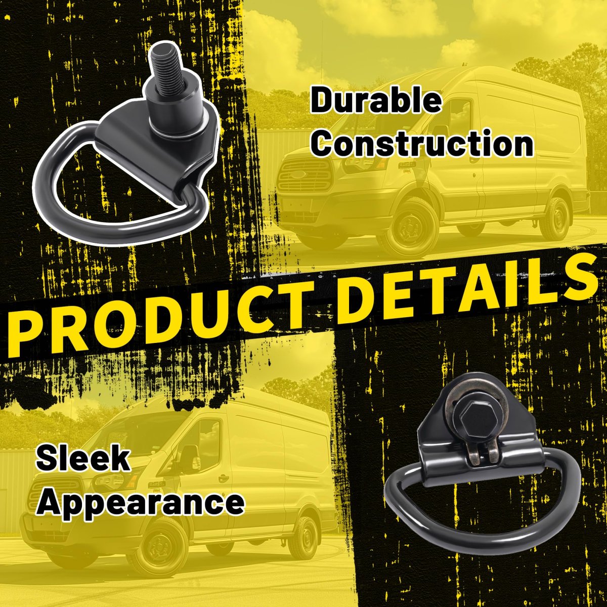 Fitment: Compatible with 2015-2024 Ford Transit-150; Compatible with 2015-2024 Ford Transit-250; Compatible with 2015-2024 Ford Transit-350.. High performance: Made of high-quality steel, these cargo D-hooks can withstand heavy use and ensure the stability of the goods during driving.. Convenient use: D-Hooks installed in the vehicle make it easy for users to use them to fix objects of different sizes and shapes, which enhances the convenience and practicality of users.. Package Included: You will receive 6 D-Hooks. Including installation accessories but not instructions.. Installation: Easy Bolt-on installation. Professional installation is highly recommended..Other fine products