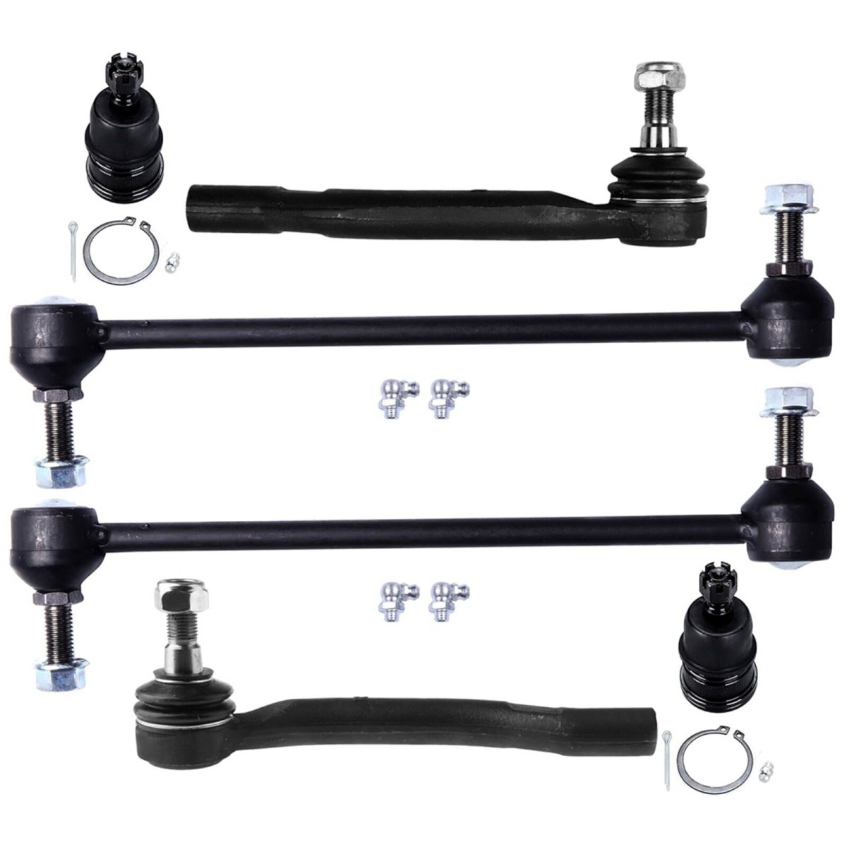 [SUSPENSION KIT FITMENT] 2001-2005 For Acura MDX, 2003-2005 For Honda Pilot. [SUSPENSION SYSTEM FUNCTION] Suspension system transmits the force and force twist acting between the wheel and the frame, buffering the impact force transmitted from the uneven road surface to the frame or the body, and attenuating the vibration caused thereby. [SUSPENSION PARTS FEATURES] Made from forged steel, with plastic insert, filled with grease, Parts are phosphatized to ensure strength and enhance aesthetics. [SUSPENSION KIT CONTAINS] 1PC X ES3716 Front Outer Tie Rod End - Passenger Side, 1PC X ES3717 Front Outer Tie Rod End - Driver Side, 2PC X K80281 Front Lower Ball Joint, 2PC X K90349 Front Sway Bar End Link.Other fine products