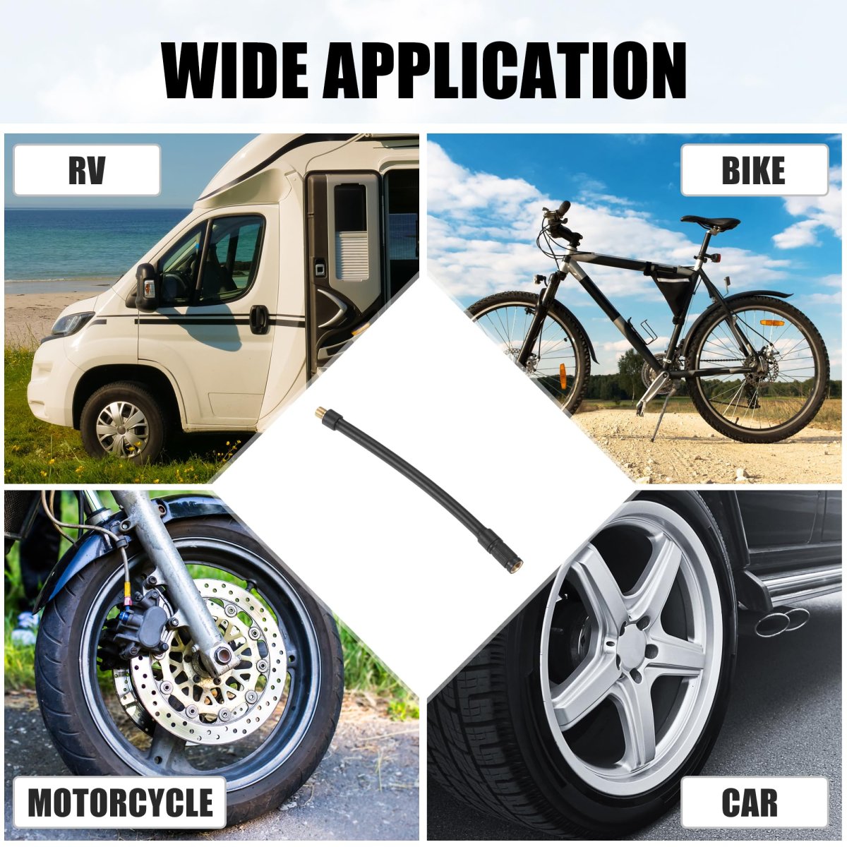 Wide Application: Compatible for tire inflation for cars, motorcycles, bikes and mountain bicycles, but need to under 300psi and not for heavy vehicles. For 5/16-32 standard tire valve stem thread connection.. Reliable Material: Quality cooper metal connector for longer lifespan. 3-layer air chuck with air hose, which is nylon-wrapped and non-slip with flexibilty. Extra thick and no worry for air leakage.. Design: With locking air chucks.But without air release valve. Length: 17.5cm / 7" / 1ft. Easy to use: Clip the air chuck adapter to the end of the tire inflator. Clip another onto tire valve stem. Then, it's easy to depress and quick to inflate without air leaking.. Package Included: 1 x Tire Inflator Air Chuck Extension Hose.
