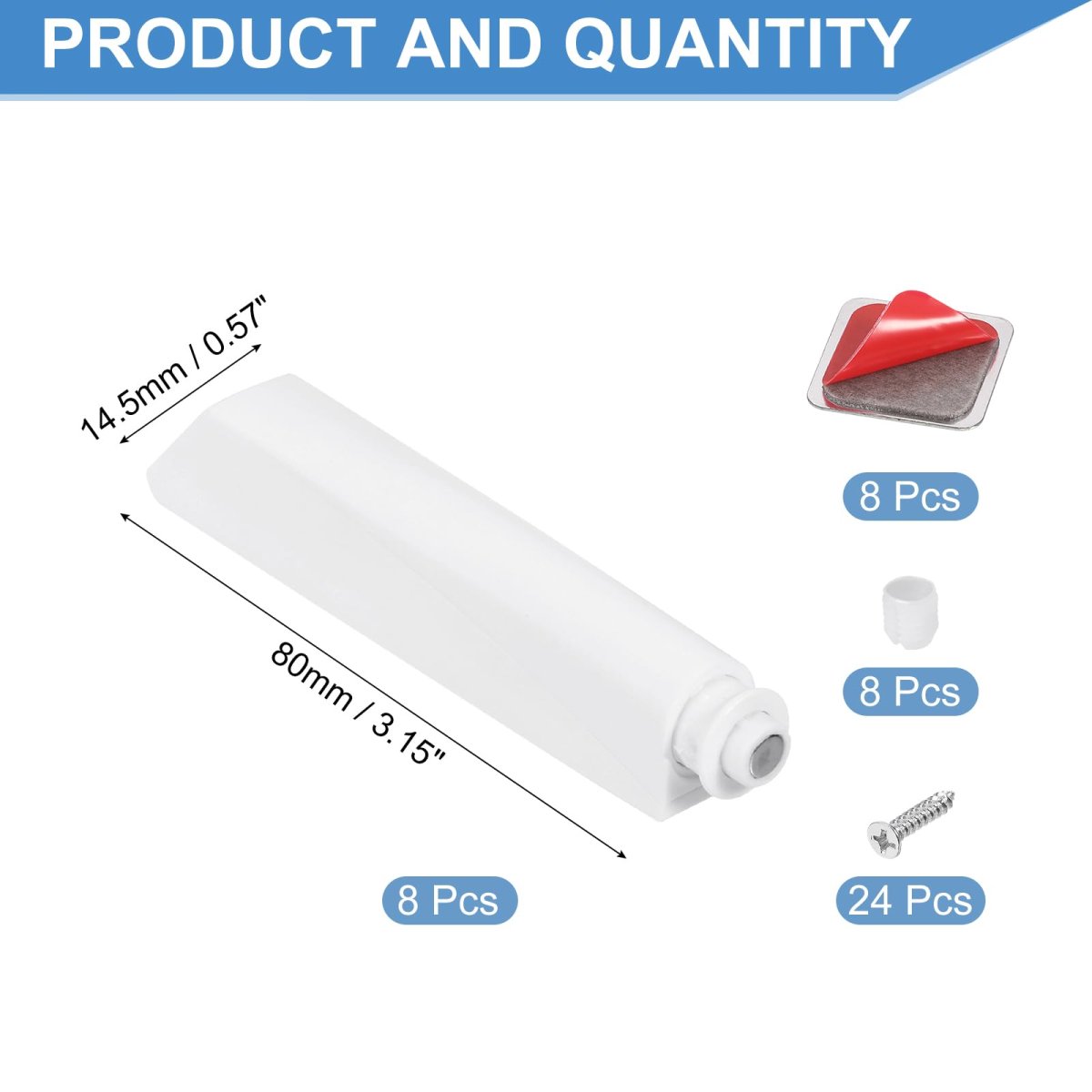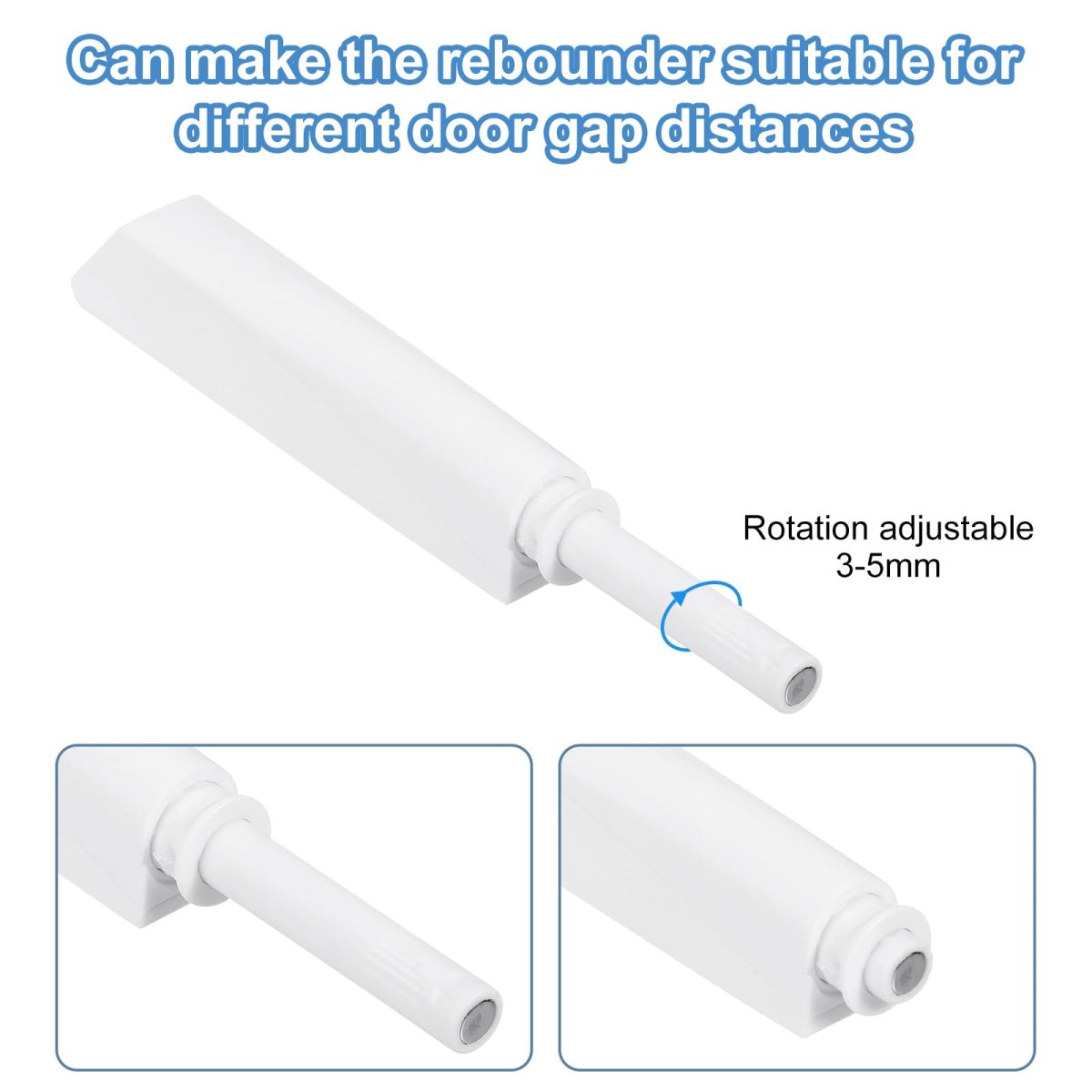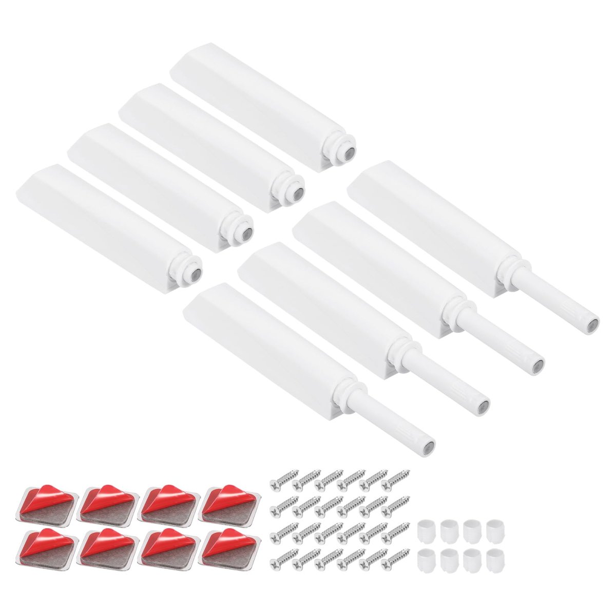 What you get: You will get 8 Pcs of Magnetic Push Latch, which made of Plastic and color is White. The Latch length is 80 mm / 3.15 inch, width is 14.5 mm / 0.57 inch.. Material: Made of Good-Quality base and durable spring mechanism ensures anti-rust and corrosion resistance, making it a timeless choice for medium-sized doors.. Design: Our push to open system is designed with snaps at the tail and head of the base, which makes the latches more stable and not easy to fall off.. Easy to Use: Built-in spring-loaded plunger, you can just simply press the door to latch. Eliminates the need for handles or knobs. Create the clean, seamless look of no knobs. Suitable for use with hinges without self-closing feature.. Secure Closure: Our push to open system features a long-stroke design with a built-in magnet that ensures a secure close point, preventing "drifting open" doors. You can rotate the magnetic tip of the inner core left or right to adjust its extra extension length of 2-9 mm to fit the gap of the door..