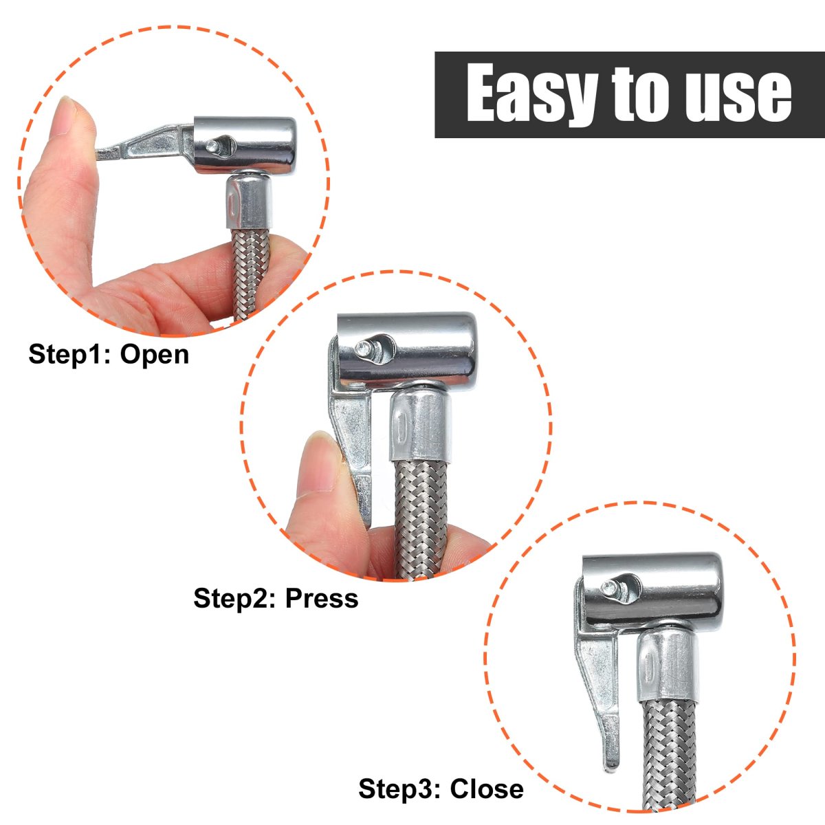Tire inflator chuck adapter can suitable for many tires, it can connect to your tire quickly for speedy inflation, suitable for bike, motorcycle, car air fill.. Nice tight seal lock on tire chuck, corrosion-resistant, wear resistance, good performance, durable and flexible. durable and not easily damaged.. No additional tool is required, directly connect the tire. Open flow thumb press tire chuck, easy and quick hands-free inflation.. Using Step: Screw adapter end onto original inflator hose, press to clamp adapter head onto tire valve, start the inflator for a quickly and none leaking inflation.. Package Included: 1 x 80cm Tire Inflator Hose Adapter.Other fine products
