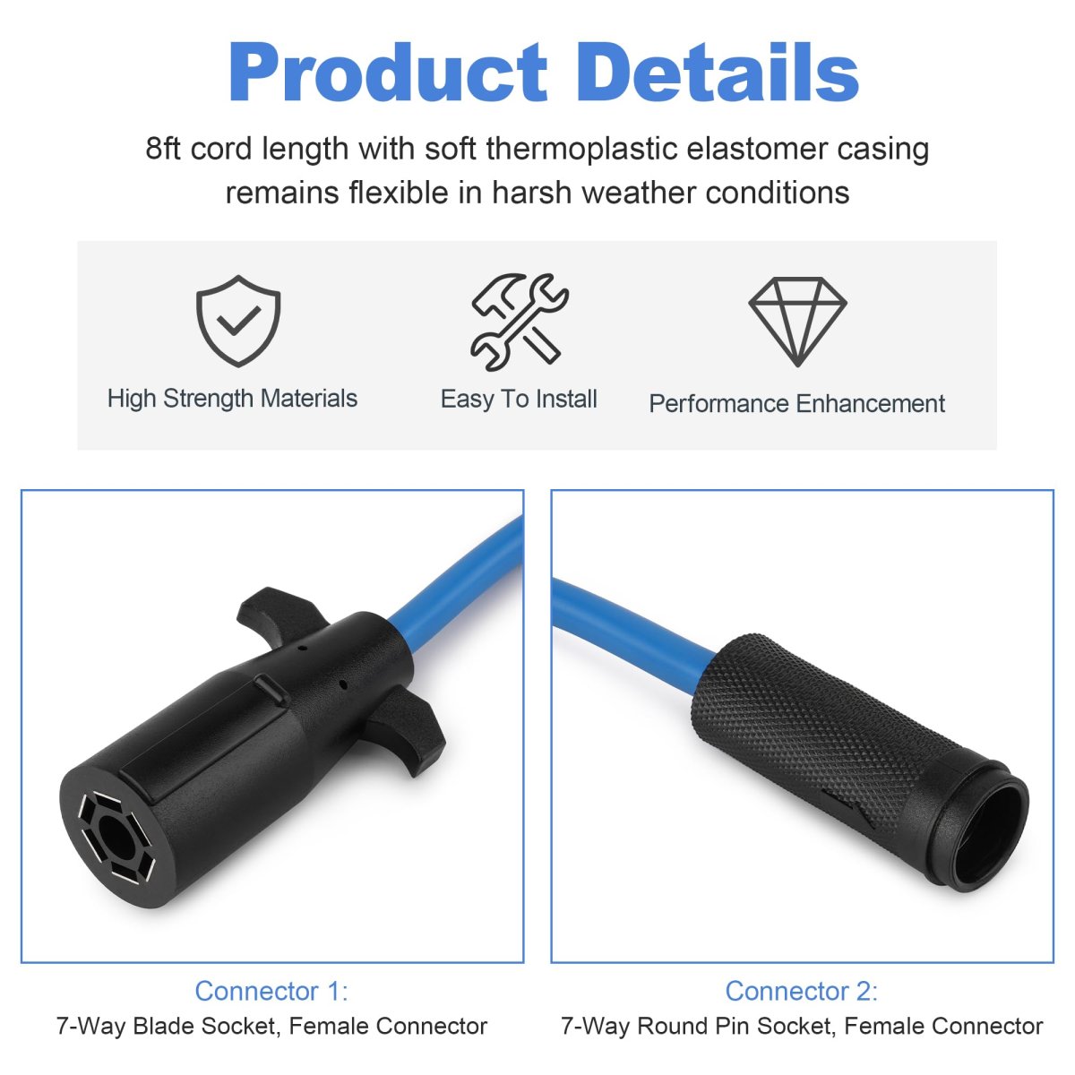 Heavy duty 7-way RV blade to round socket connector wiring cord cable harness. Connects to 7-way RV blade female socket to 7-way round female socket. Trailer front section electrical system for lighting, tail, brake, reverse, turn signals, brakes and auxiliary power. 8ft cord length with soft thermoplastic elastomer casing remains flexible in harsh weather conditions. Quick Connect, plug and play. Fits 14'-20' gooseneck trailers, bumper pull trailers and utility trailers with 7-way connection system.