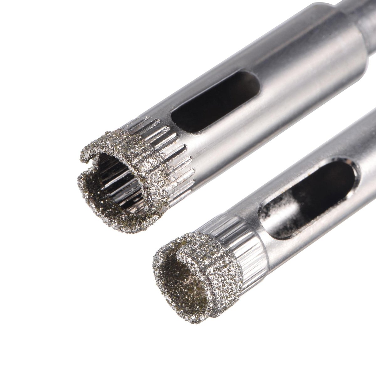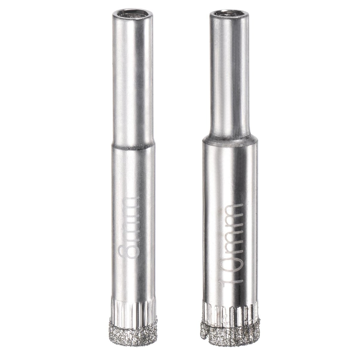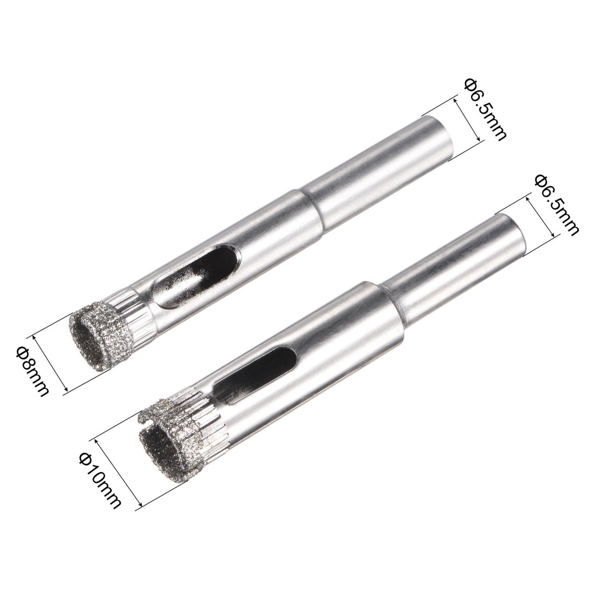 Size - 8mm Drilling Diameter, 6.5mm Shank(10pcs); 10mm Drilling Diameter, 6.5mm Shank(10pcs). Diamond Coated - Diamond coating enhances the drilling speed, which makes the bit sharper.. Nickel Plated Surface - The nickel plating surface can extend the service life and enhance surface corrosion resistance.. Special Design - Side open can remove the waste to keep the drill bit clean.. Applications - Perfect for drilling glass, ceramics, porcelain, ceramic tile, porcelain tile, limestone, slate, marble, light stone and fiberglass. (Need to be used at a low speed; Always use lubrication (water) when processing, otherwise the hole saw will burn.).Other fine products