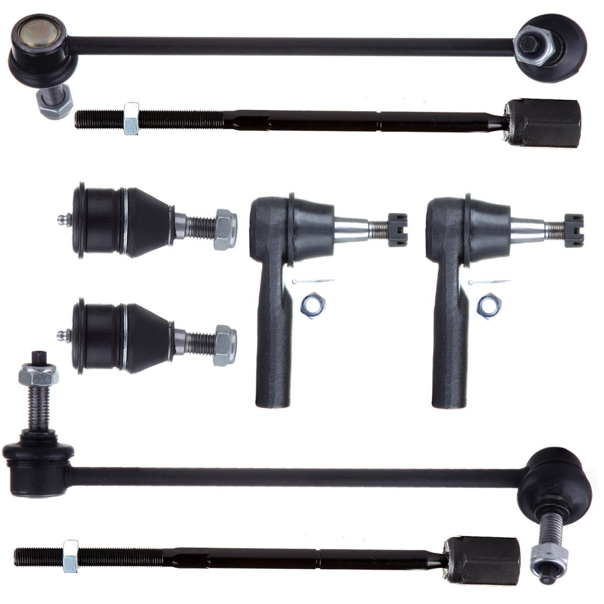 [SUSPENSION KIT FITMENT] 1996-2007 for Ford Taurus,1996-2005 for Mercury Sable. [SUSPENSION SYSTEM FUNCTION] Suspension system transmits the force and force twist acting between the wheel and the frame, buffering the impact force transmitted from the uneven road surface to the frame or the body, and attenuating the vibration caused thereby. [SUSPENSION PARTS FEATURES] Made from forged steel, with plastic insert, filled with grease, Parts are phosphatized to ensure strength and enhance aesthetics. [SUSPENSION KIT CONTAINS] 2 K8687 Front Lower Ball Joint - Non-Greasable, 1 K8734 Front Sway Bar End Link - Driver Side, 1 K8735 Front Sway Bar End Link - Passenger Side, 2 EV398 Inner Tie Rod End, 2 ES3349RL Outer Tie Rod End.Other fine products