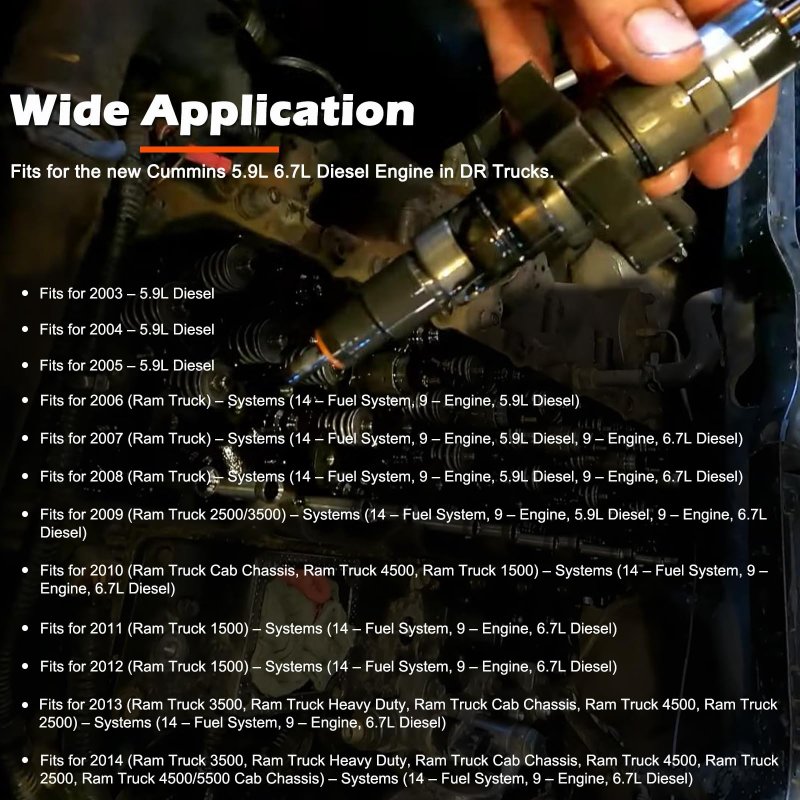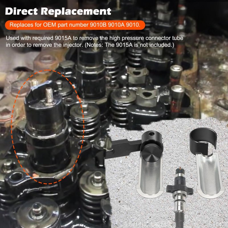 Wide ApplicationPerfectly compatible with 2003-2014 Dodge Cummins 5.9L 6.7L Diesel Engines for DR trucks. (The Specific application reference as following.). High PerformanceSpecially designed to help you easily & properly remove the fuel injector for the new Cummins 5.9L 6.7L Diesel Engines in DR Trucks, protects the new style fuel injector from damage during service procedures, saving your time, energy and money.. Direct ReplacementDirectly replaces for OEM part number 9010B 9010A 9010 both in quality and functions. Used with required 9015A to correctly disassemble the high pressure connector tube in order to remove the injector.. Superior MaterialMade from carbon STEEL, high strength, prevent corrosion and rust, wear and impact resistance, sturdy and durable. High precision and hardness ensure long term reliable service..Other fine products