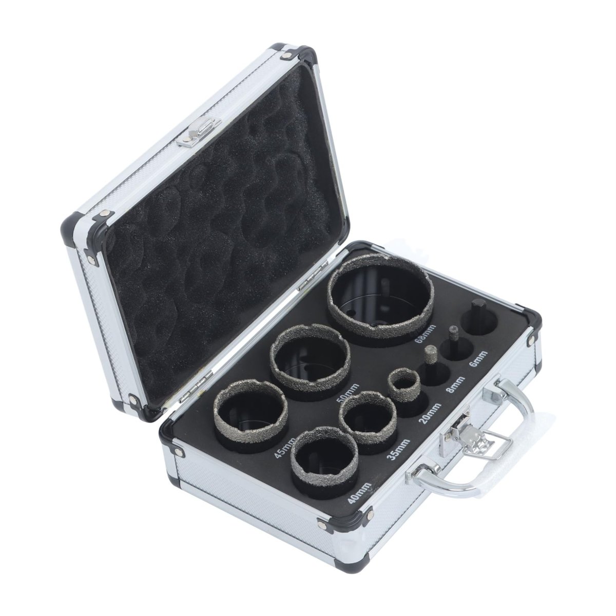 Including Products: Our kit provides 8 PC diamond drill bits, including 6/8/20/35/40/45/50/68mm and 1 PC adapter, meet different installation requirements.. Function: The diamond drill bit set can drill holes in glass, tiles, marble, stone, avoiding cracks or rough edges.. Product Advantages: Diamond hole saw set a set covering multiple sizes, eliminating the need for frequent replacement of drill bits and reducing costs.. Perfect For: The diamond hole saw set is suitable for various applications such as drilling holes in wall tiles, drilling holes in marble countertops, and creating openings in glass bottles.. Design: Equipped with a lightweight aluminum storage box, it is convenient for organizing and carrying, allowing easy access anytime and anywhere..Other fine products