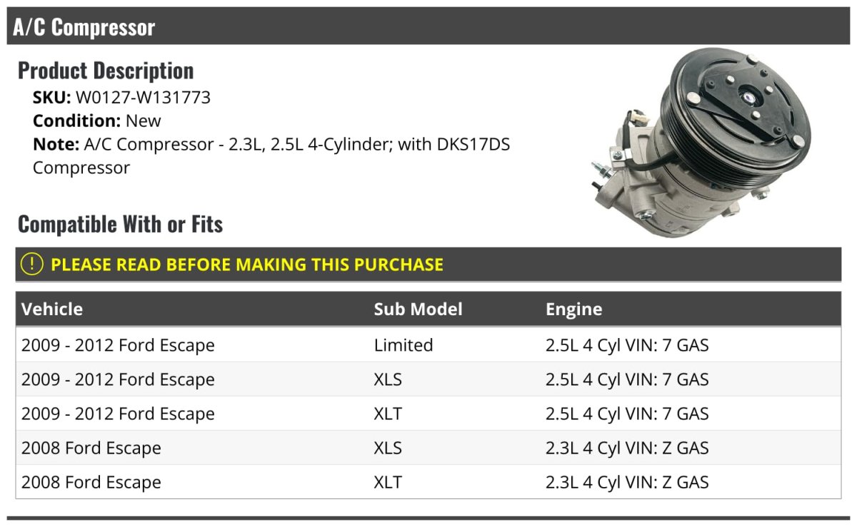 A/C Compressor - 2.3L, 2.5L 4-Cylinder; with DKS17DS Compressor. Compatible with or fits: 2009 - 2012 Ford Escape Limited 2.5L 4 Cyl VIN: 7 GAS 2009 - 2012 Ford Escape XLS 2.5L 4 Cyl VIN: 7 GAS. Compatible with or fits: 2009 - 2012 Ford Escape XLT 2.5L 4 Cyl VIN: 7 GAS. Compatible with or fits: 2008 Ford Escape XLS 2.3L 4 Cyl VIN: Z GAS. Compatible with or fits: 2008 Ford Escape XLT 2.3L 4 Cyl VIN: Z GAS.Other fine products